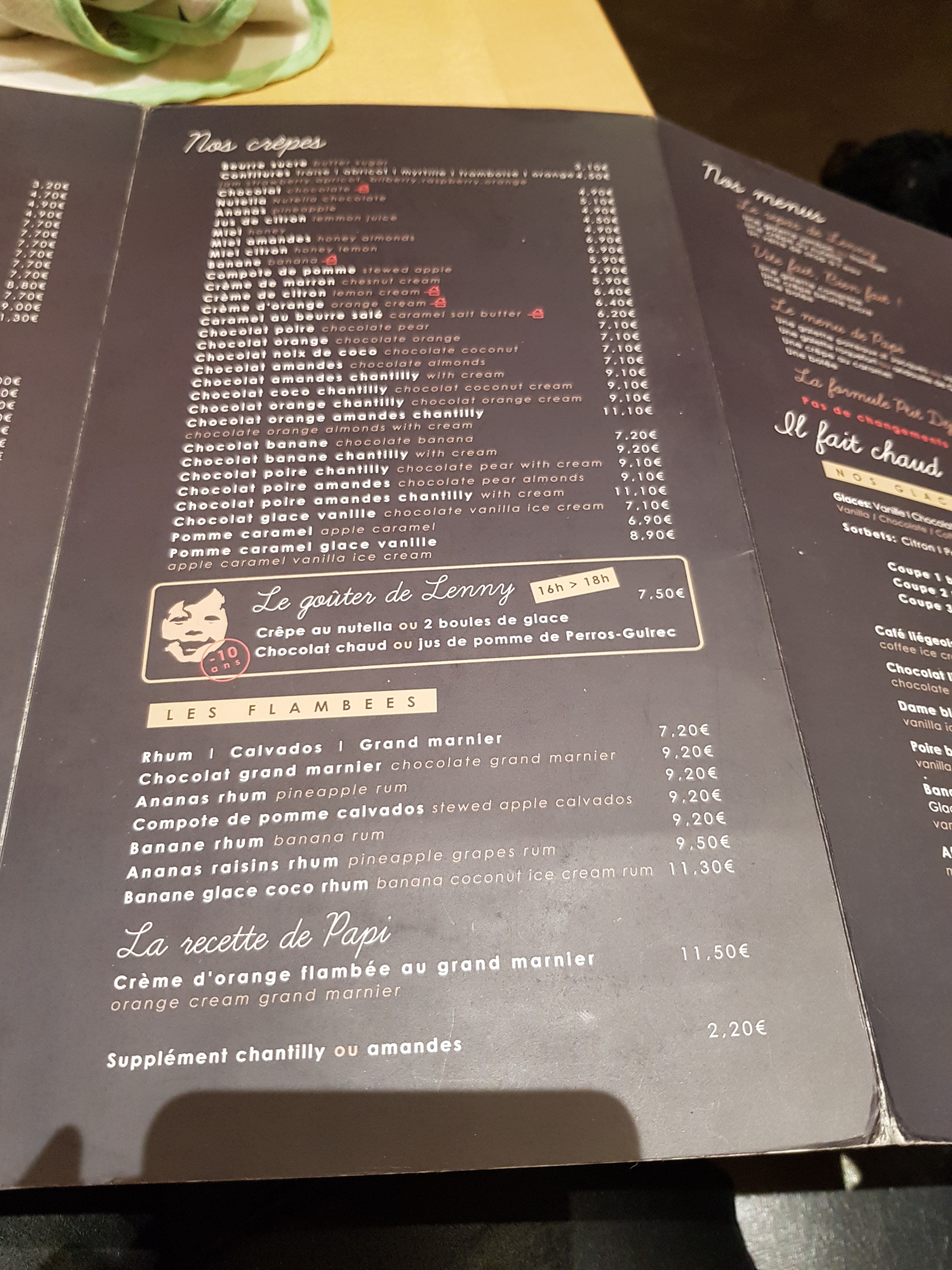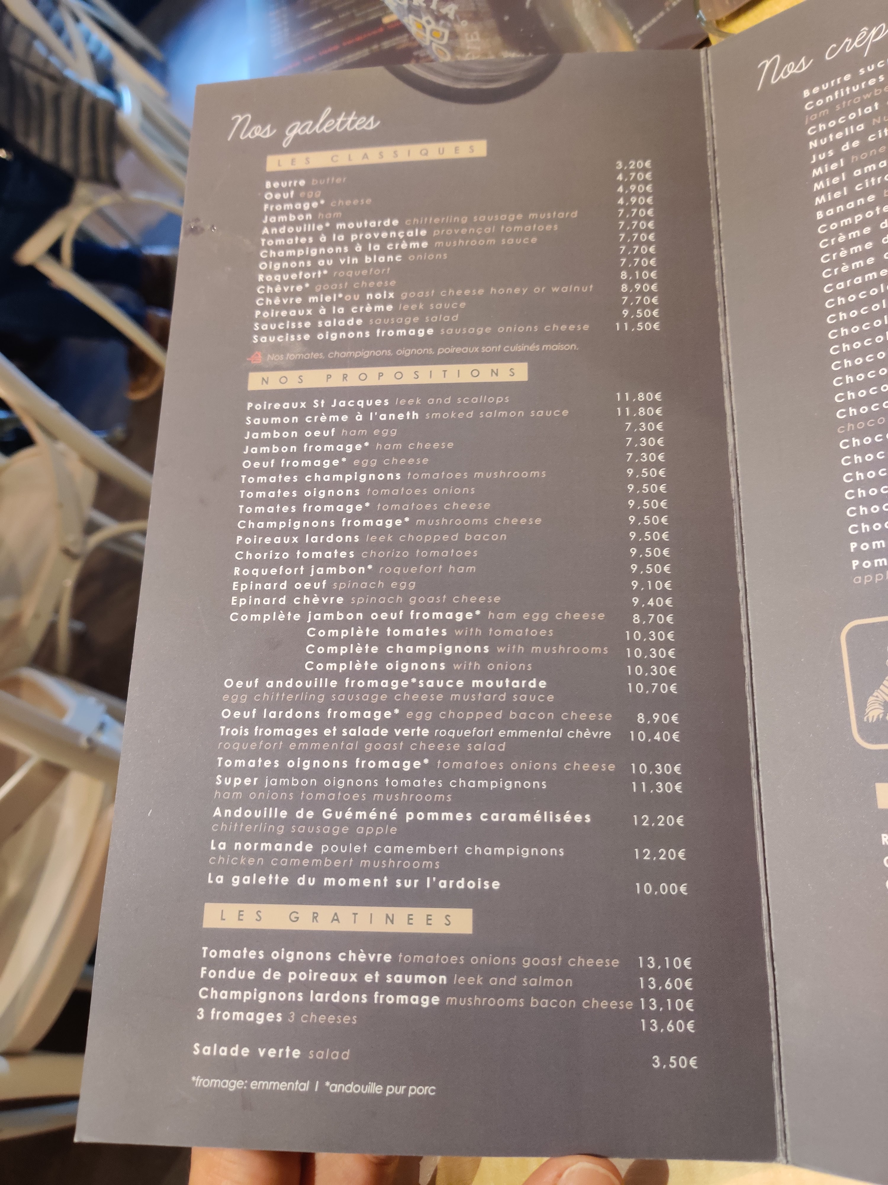 EN : nice place, the food is very tasty, the servers ard reactive, the prices are reasonnable : between 4€ and 11€ for a salty crêpe and 3€ to 9€ for a sweet crêpe. Special mention for the Crêpe caramel beurre salé FR : bel endroit. Les produits sont très bons, les prix sont raisonnables : entre 4€ et 11€ pour une galette salée et 3€ à 9€ pournune crêpe sucrée. Mention spéciale à la crêpe caramel beurre salé