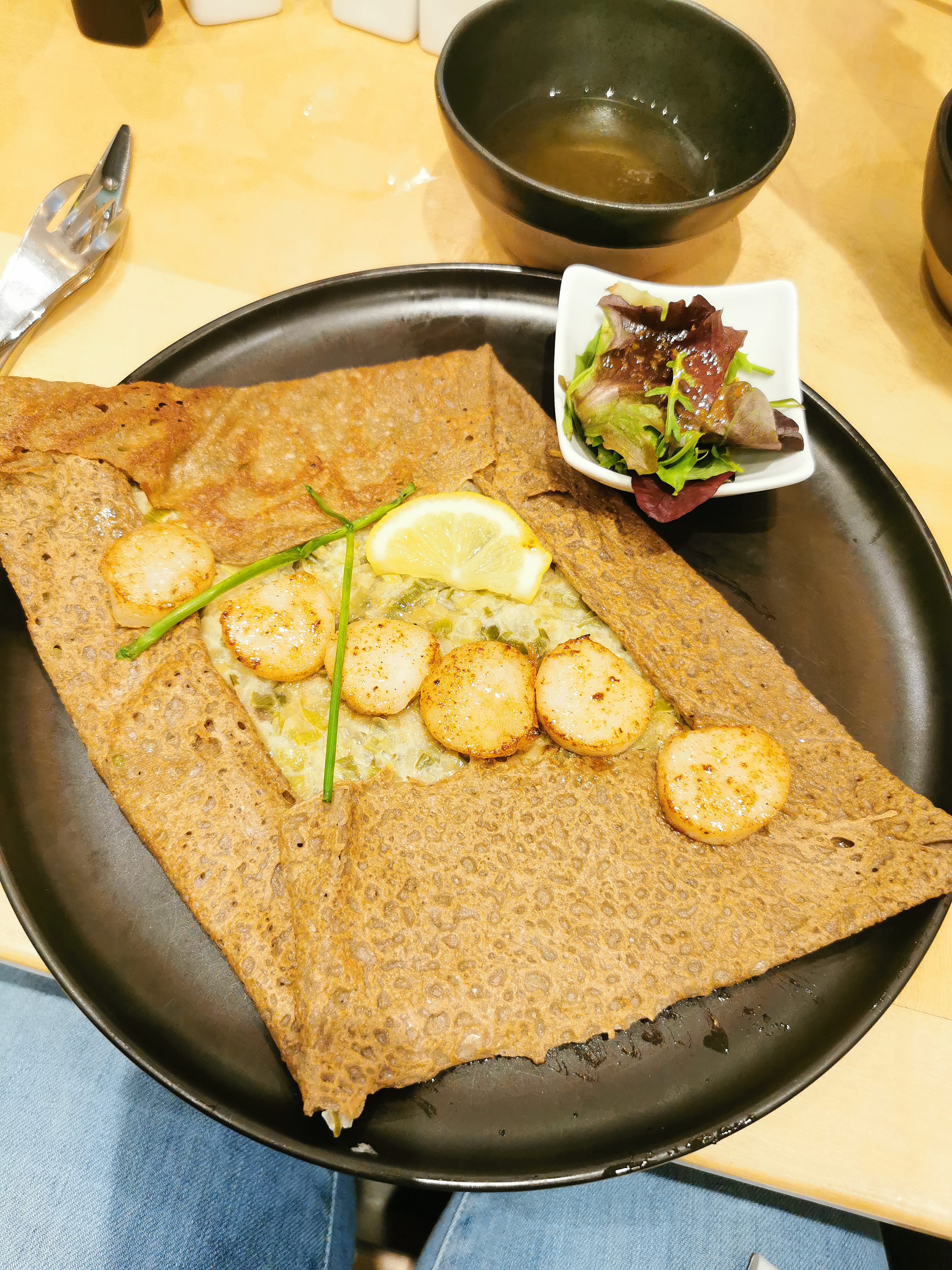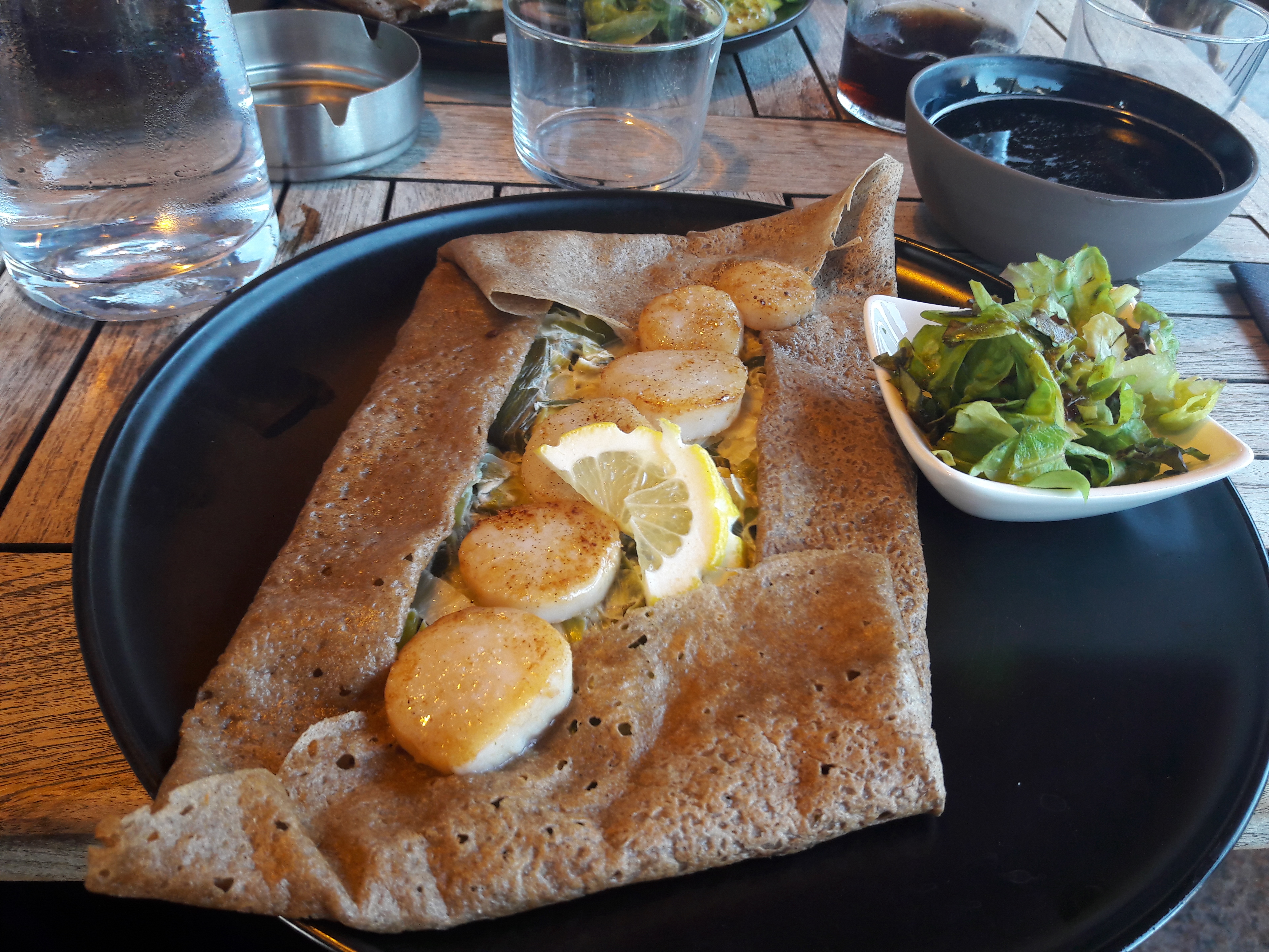 Galette médiocre poireaux saint Jacques ( pétoncles?) Crêpe en dessert sèche enfin très décevant