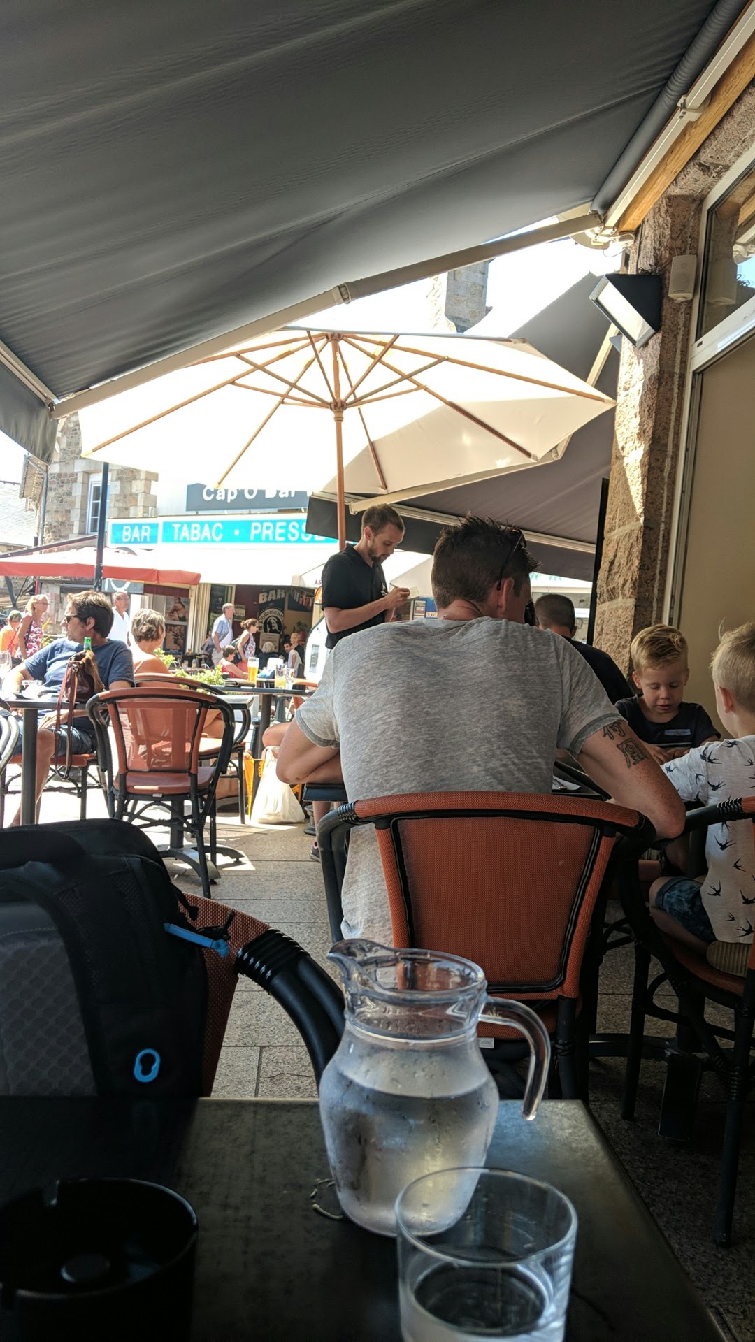 Nous nous sommes arrêtés pour prendre un café en terrasse. Le serveur nous a bien vu nous installer. Nous avons attendu un bon quart d'heure pendant qu'il discutait avec des clients en terrasse également. Il n'est jamais venu nous voir et quand nous sommes partis nous a demandé si nous étions pressés. Alors non car nous sommes en vacances et cela ne nous dérange pas qu'il discute un peu avec les habitués mais le minimum aurait été au moins de venir prendre notre commande.