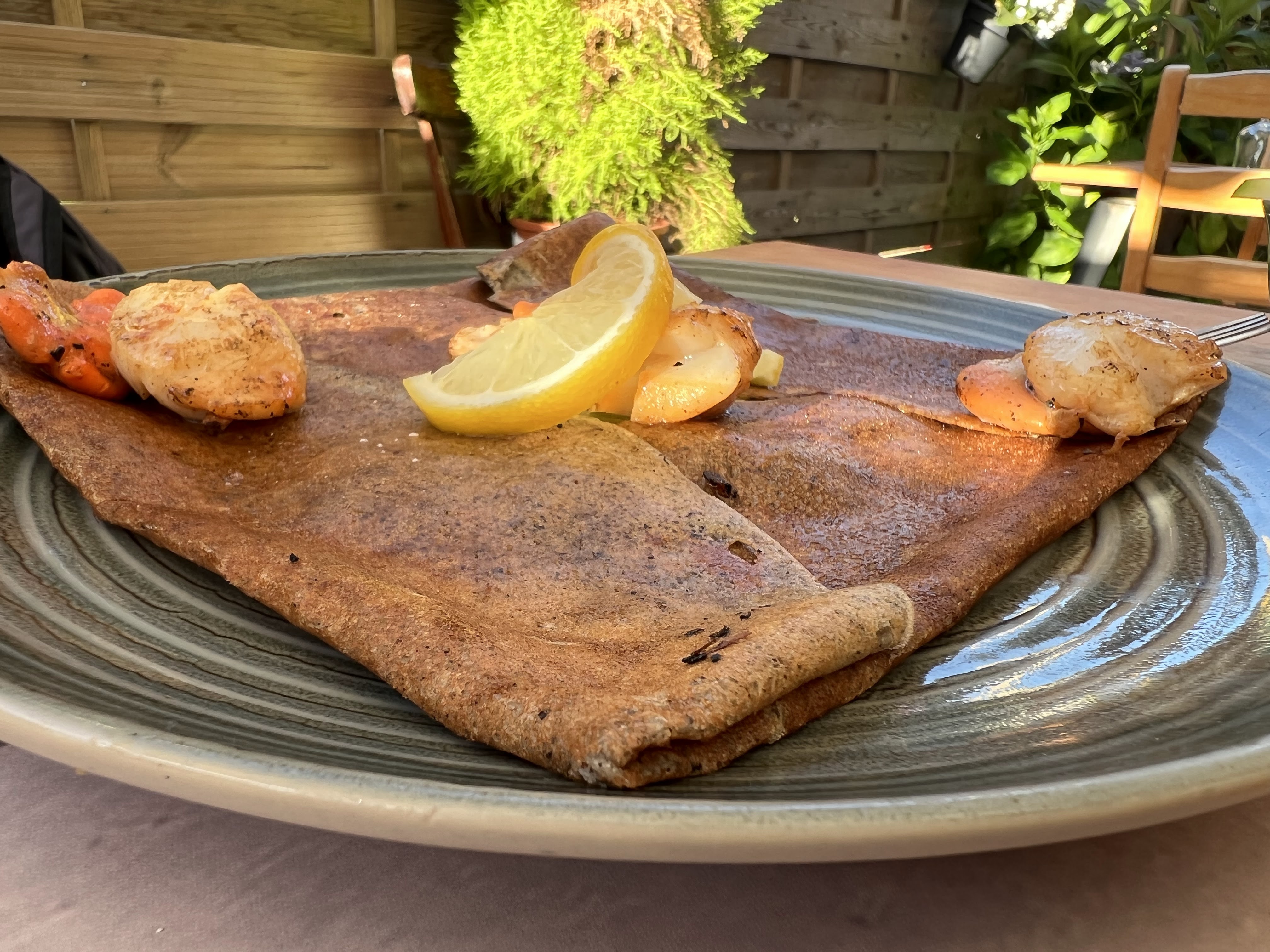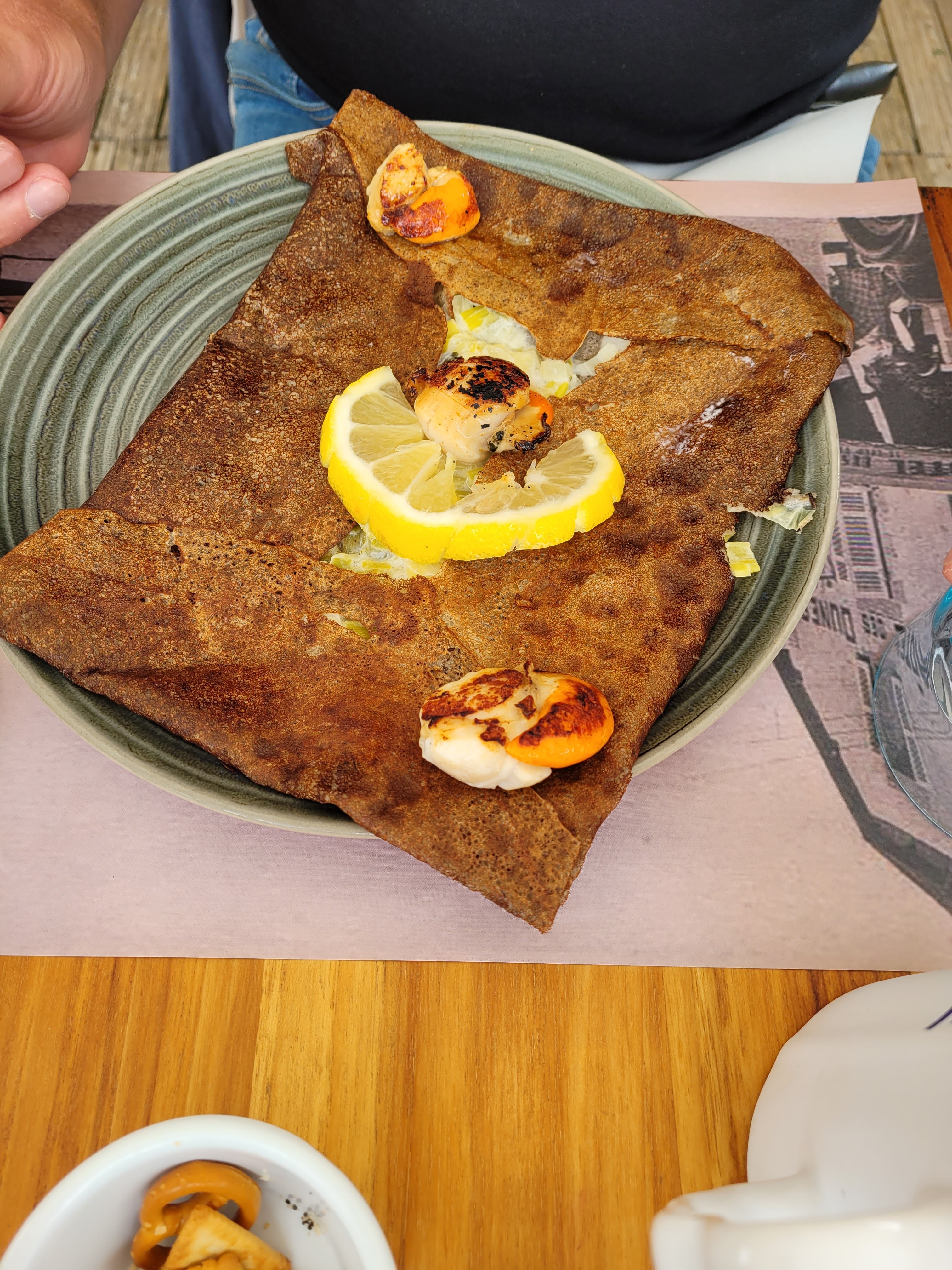 Mauvaise expérience Cadre sympathique mais service déplorable Serveurs pas souriant, pas de bon appétit, assiettes presque jetés sur les tables et pas en même temps, mon collègue a été servit quasiment 10 minutes avant moi et ma attendu et donc mangé froides ses moules. Crêpes correct mais pas incroyable, une galette trop cuite personnellement je ne la sers pas, je la recommence, surtout à 9 euros la crêpe... Déçu