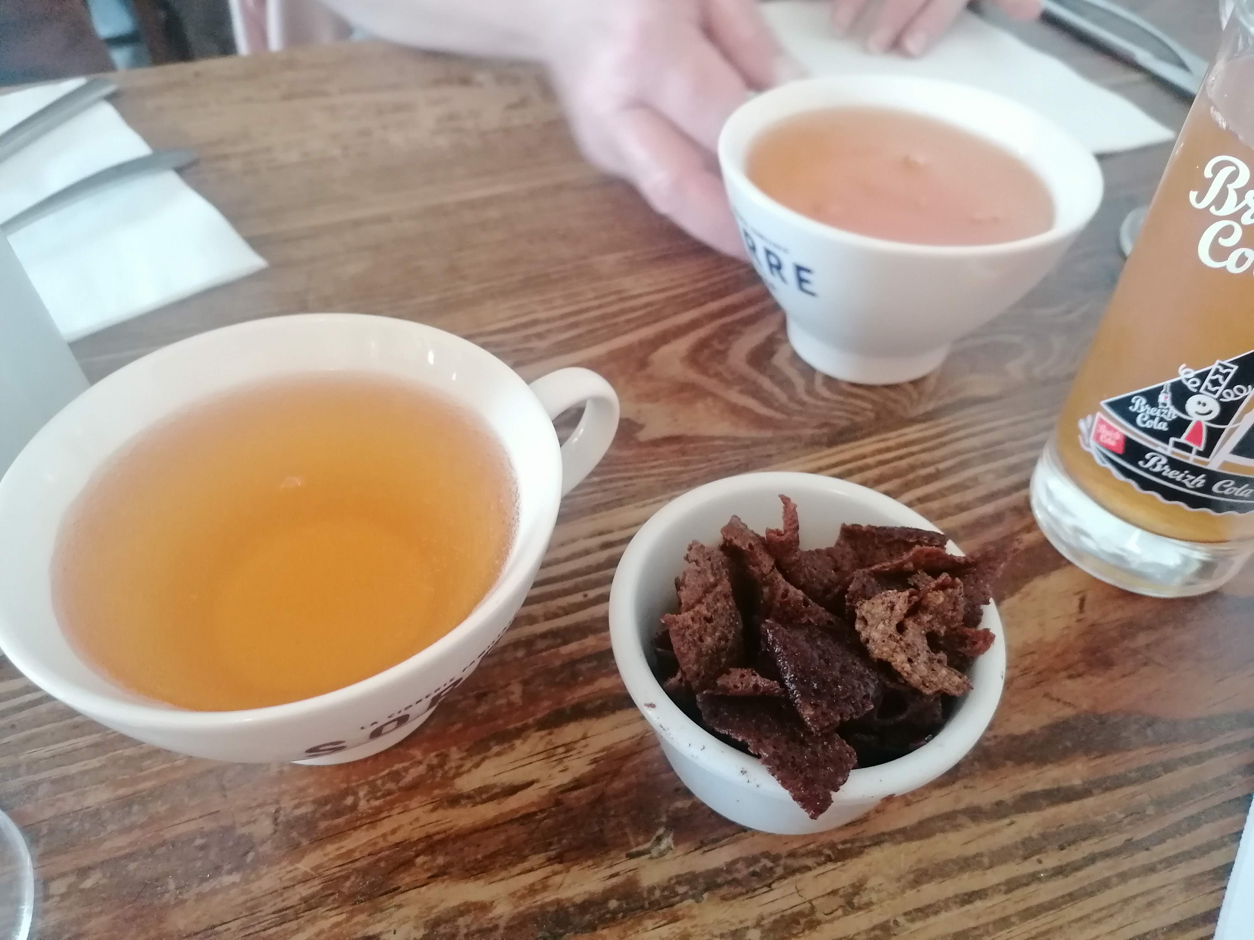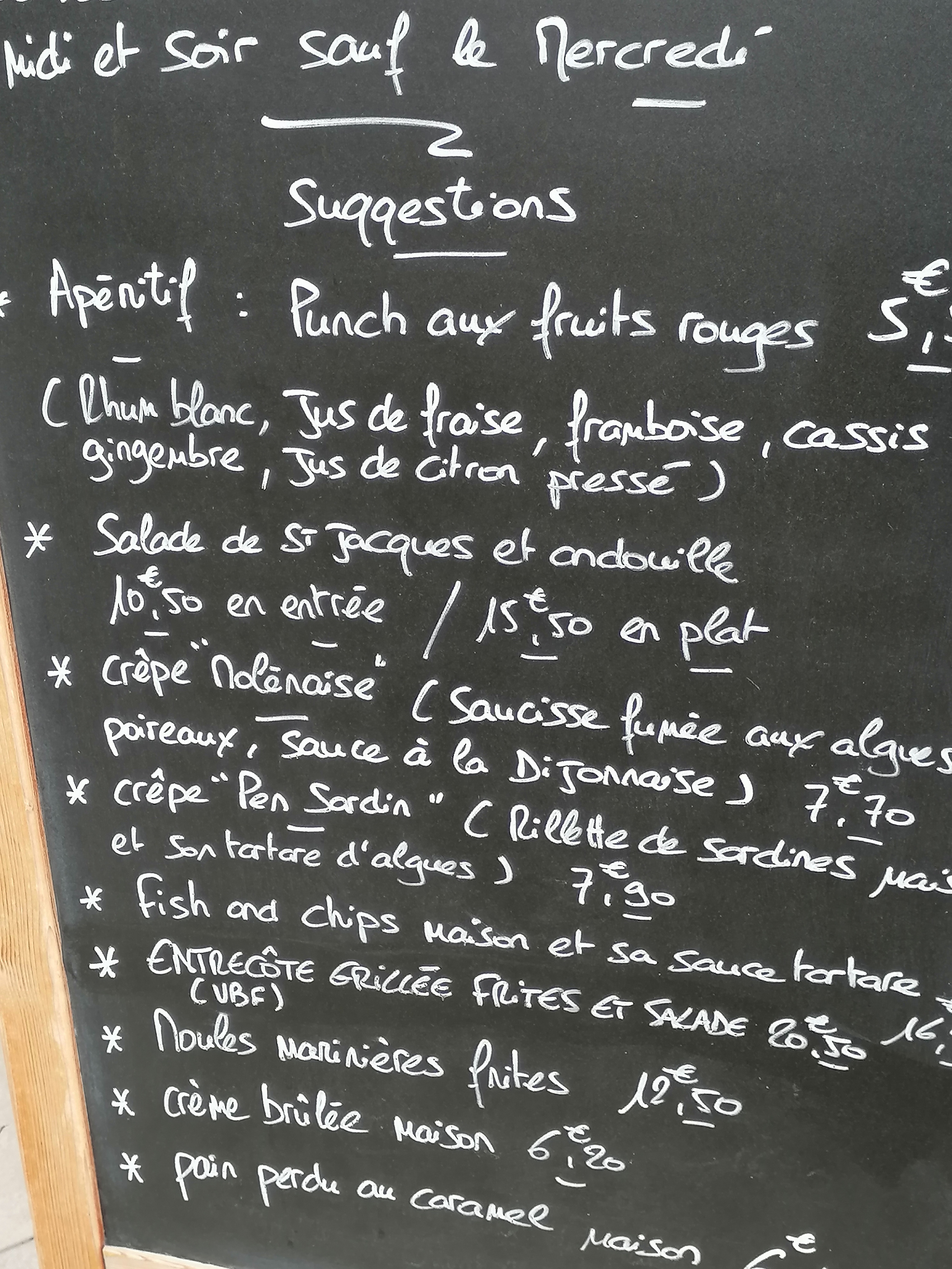 Les plats, un vrai délice, avec des produits frais. Nous sommes partis sur les suggestions du jour : Saint-Jacques de Saint Brieuc et Pesked ha farz (poissons). Légumes all dente avec les 3 belles Saint-Jacques. Et le farz sac’h », à base de farine de sarrasin. Pour les plats et l'ambiance, je recommande. Nous y reviendrons.