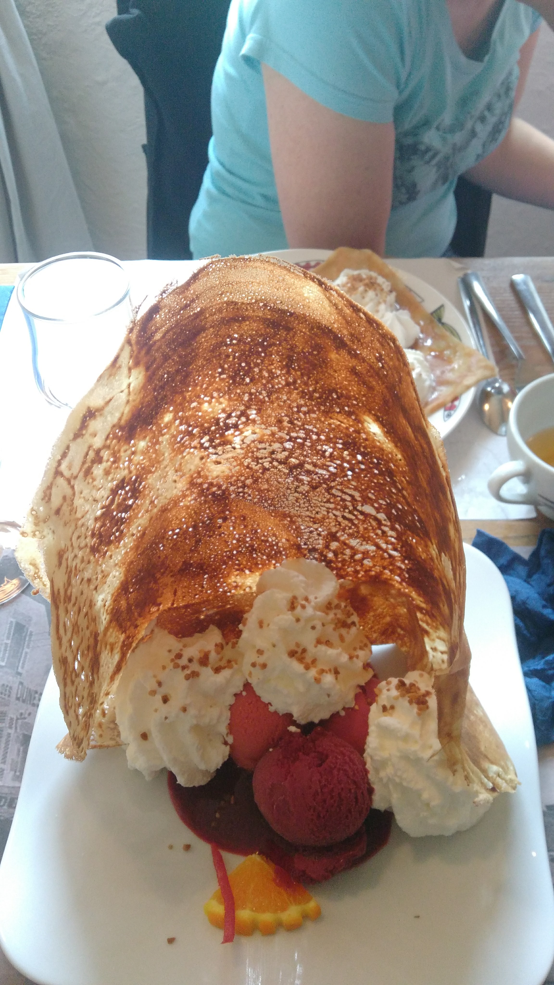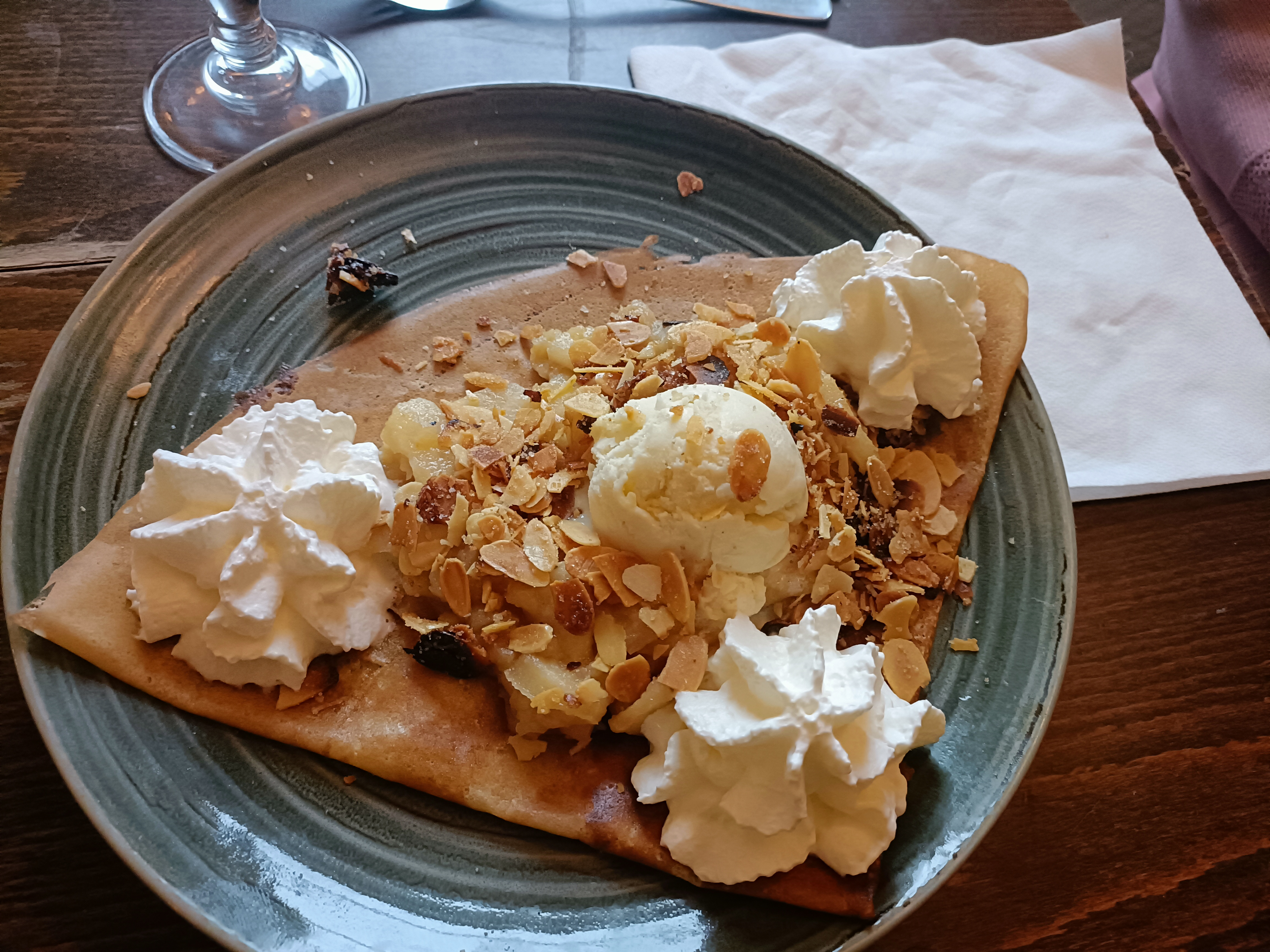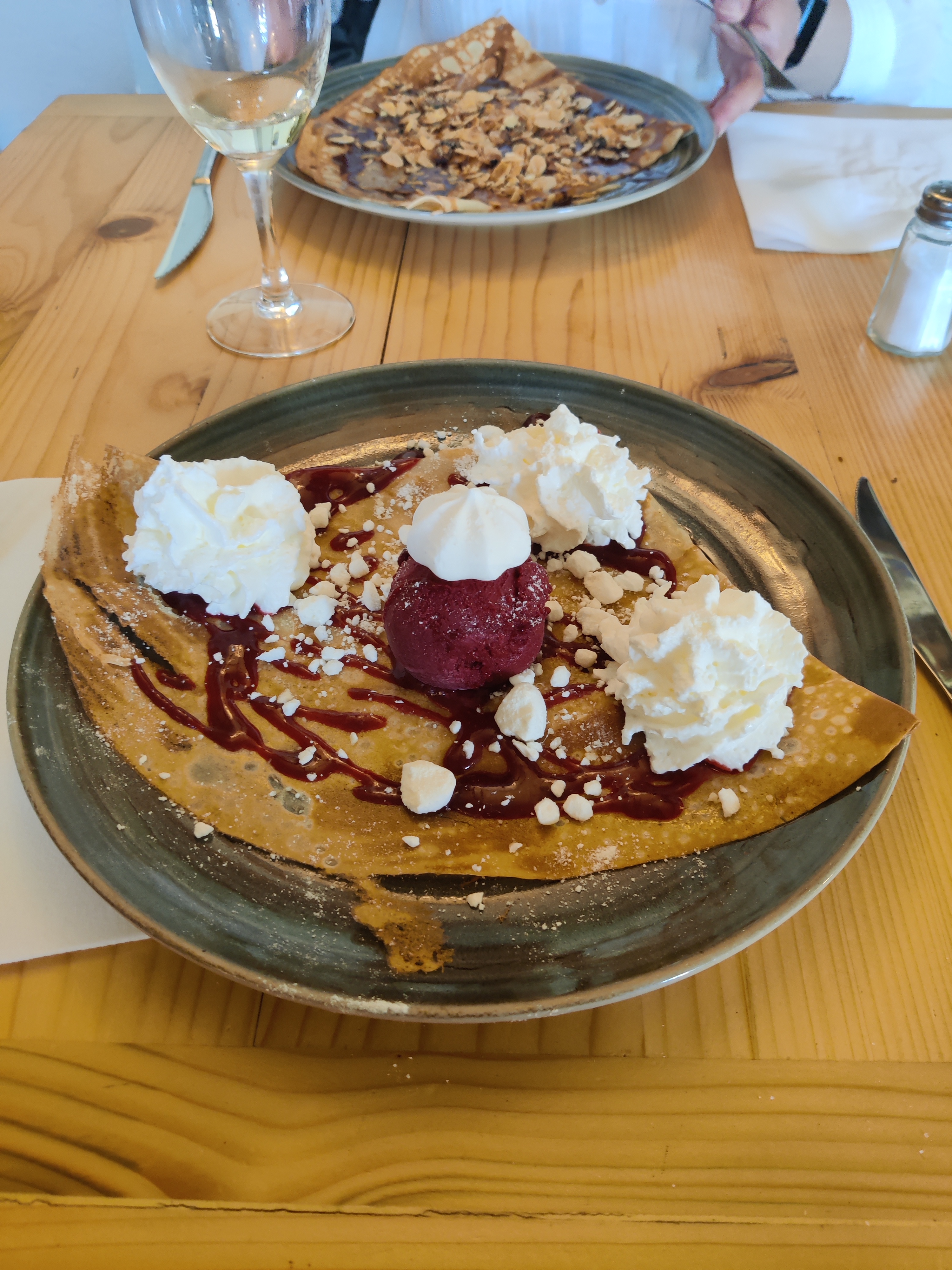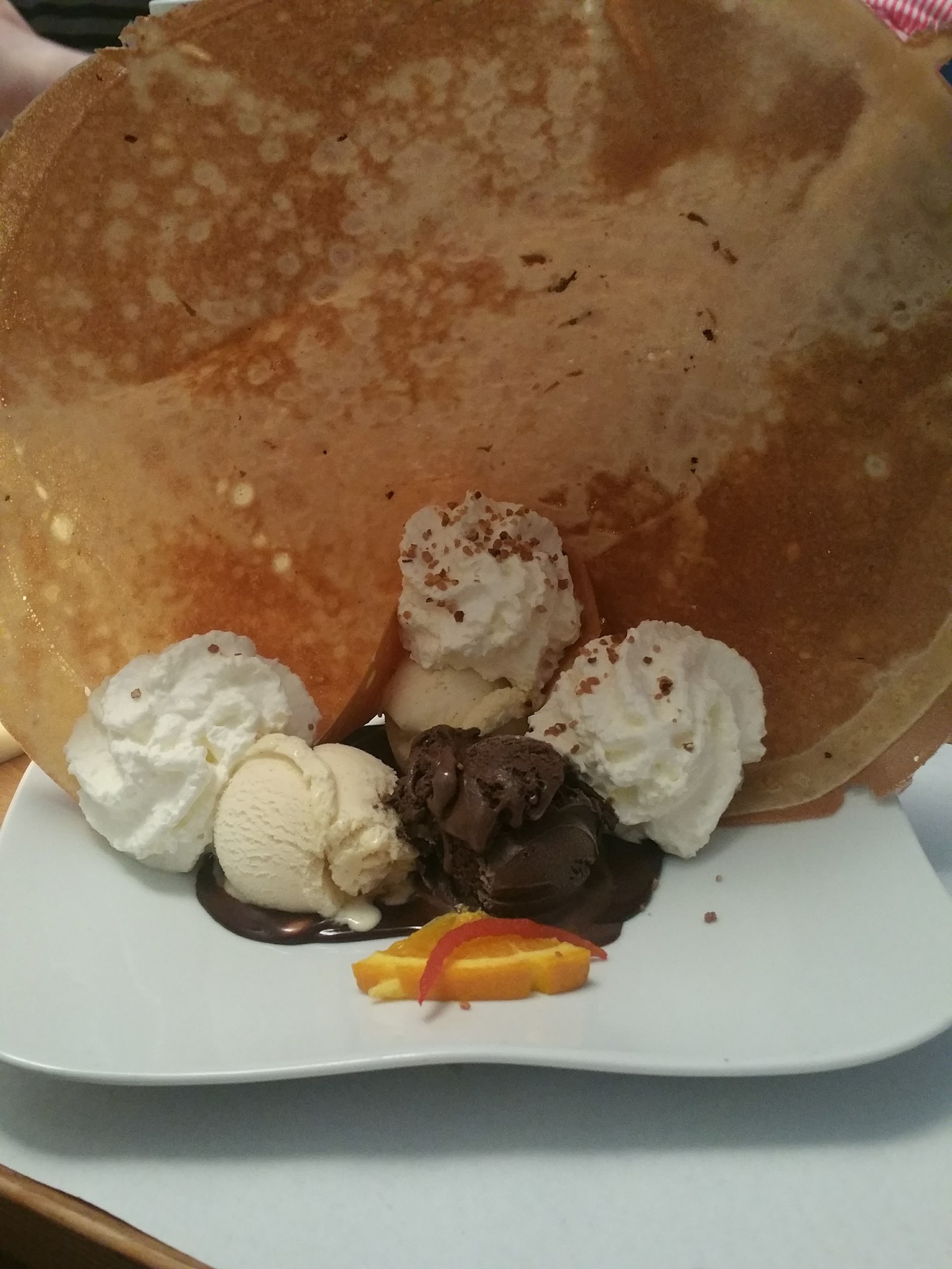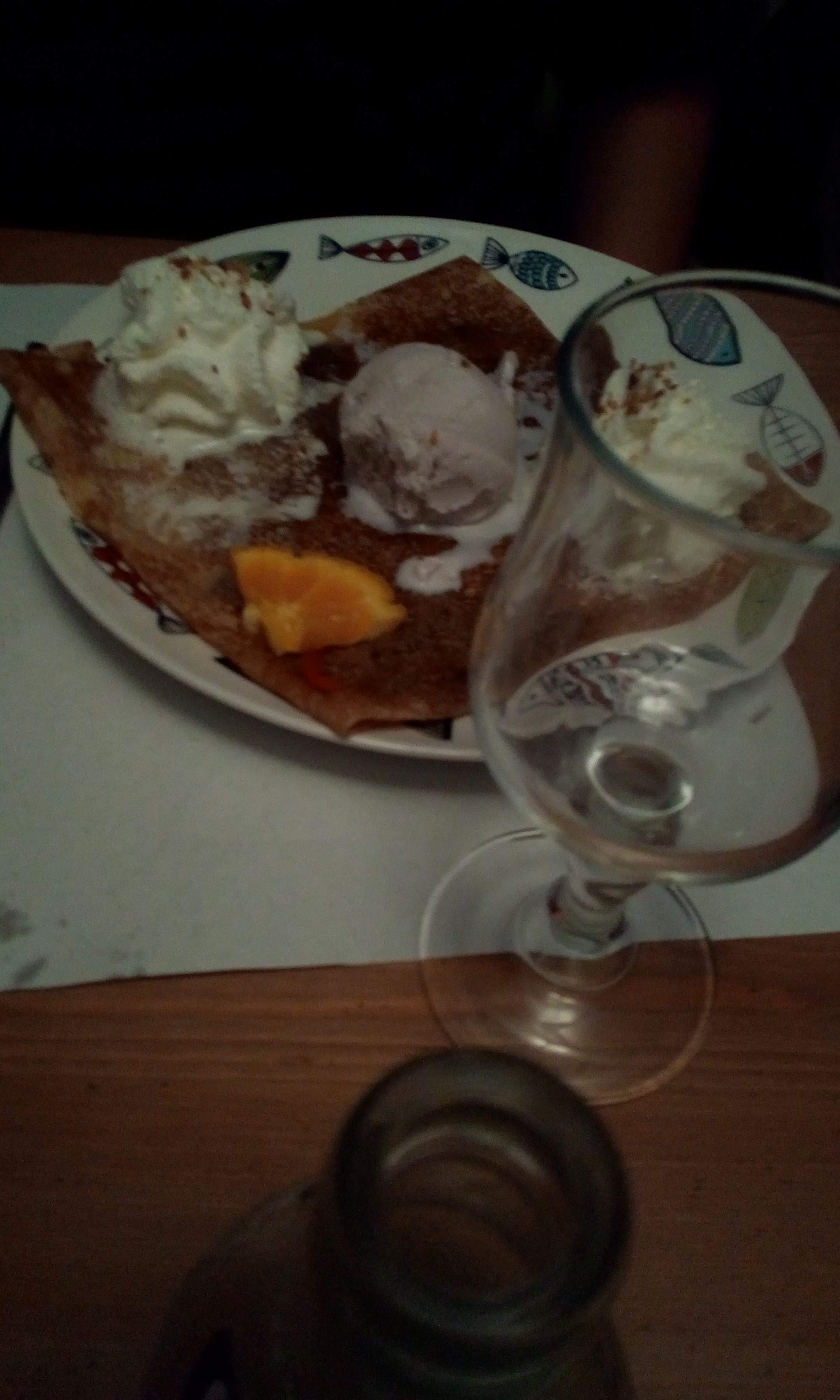 Dommage que ma crêpe chèvre/magret était froide. Les proportions sont correctes mais si vous êtes bin mangeur, prenez une entrée avant la crêpe. Les desserts glace sont bof et la présentation pas appétissante. Ne vaut pas la crêperie La frégate mais comme les prix sont raisonnables et qu'il n'y a pas beaucoup d'autre choix dans le coin, peut convenir. Attention malgré tout, il faut réserver.
