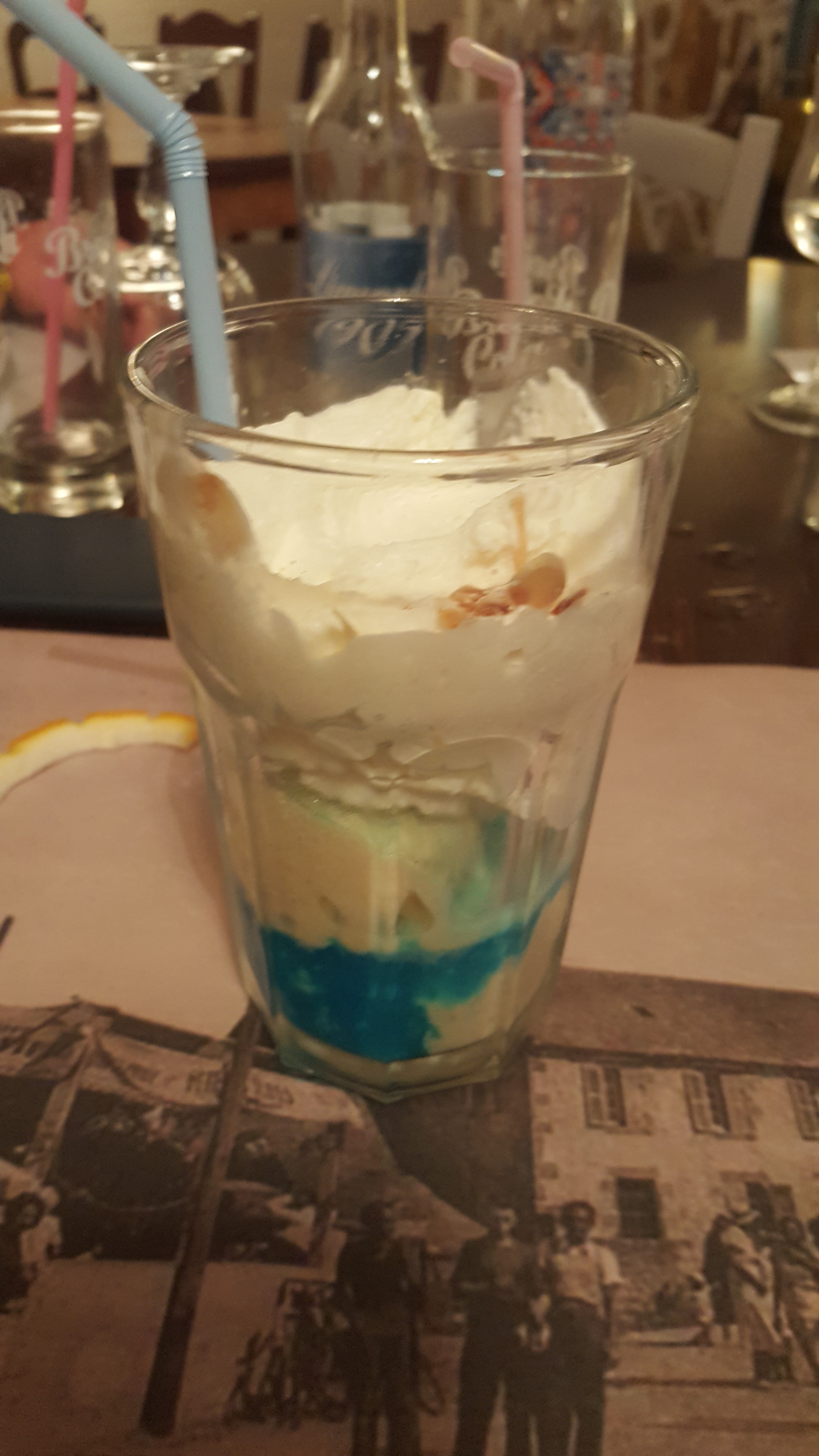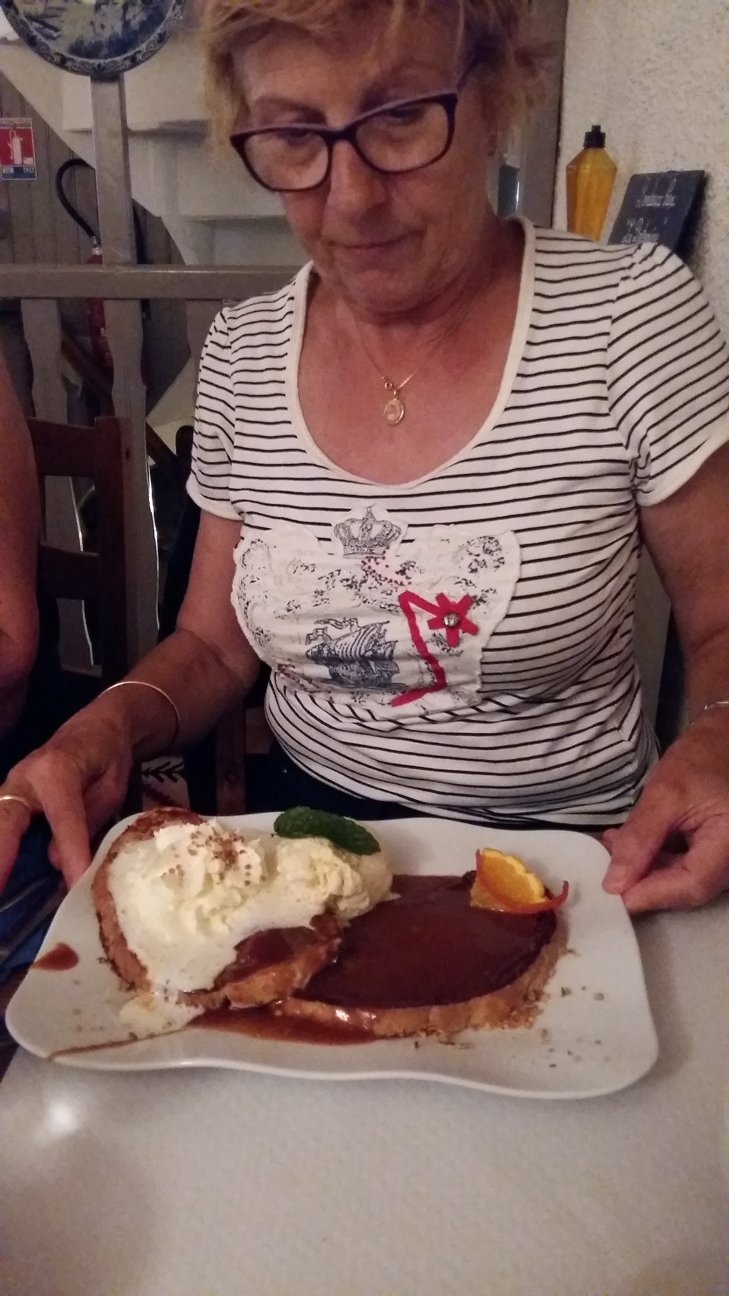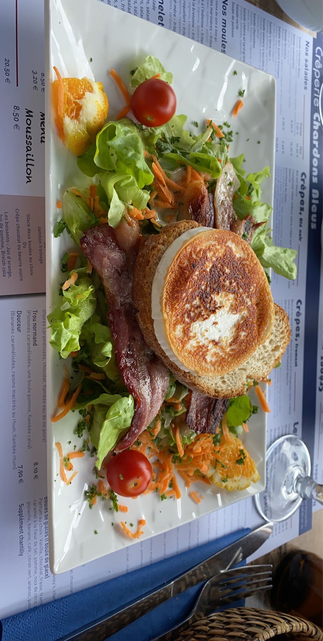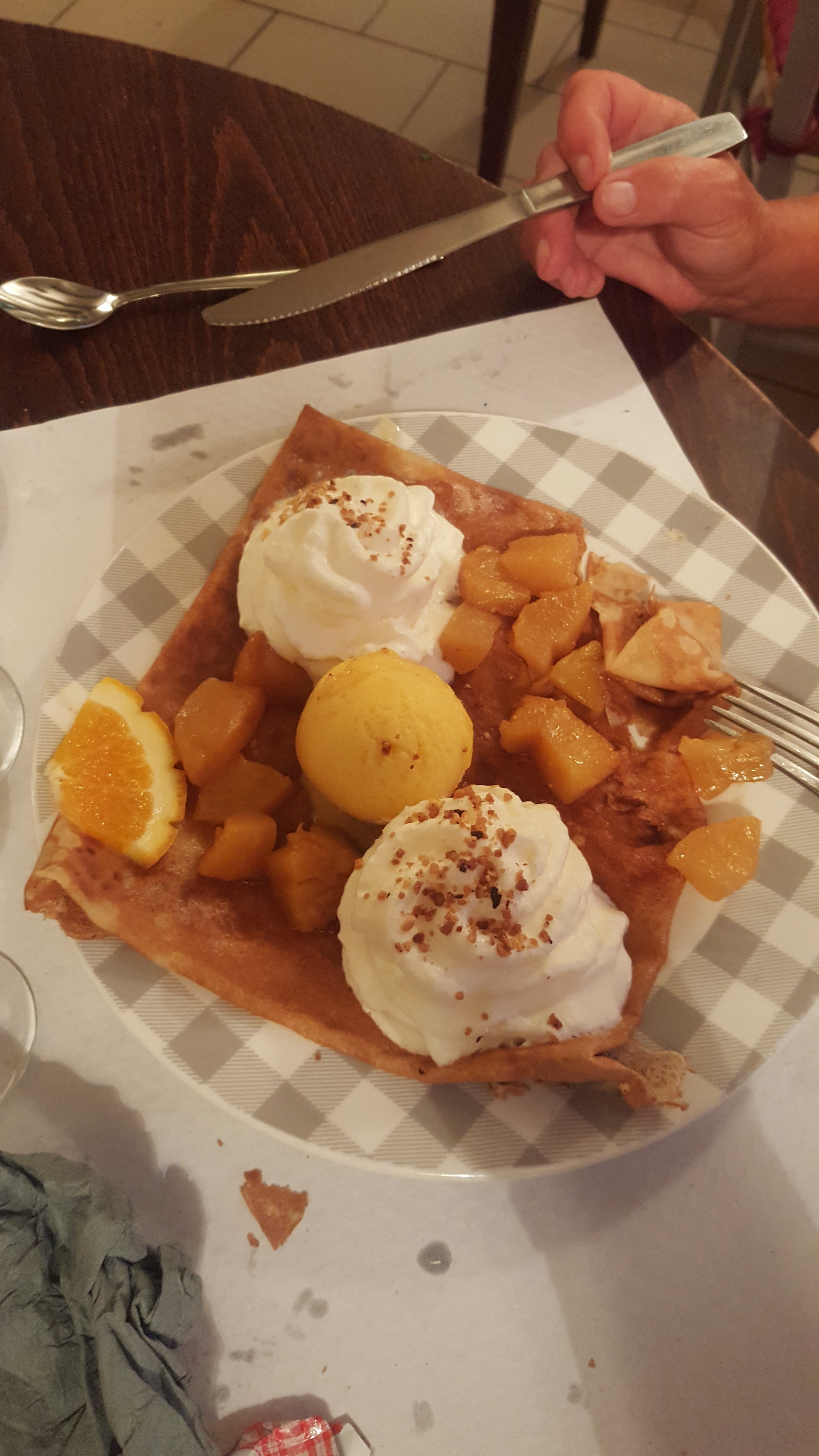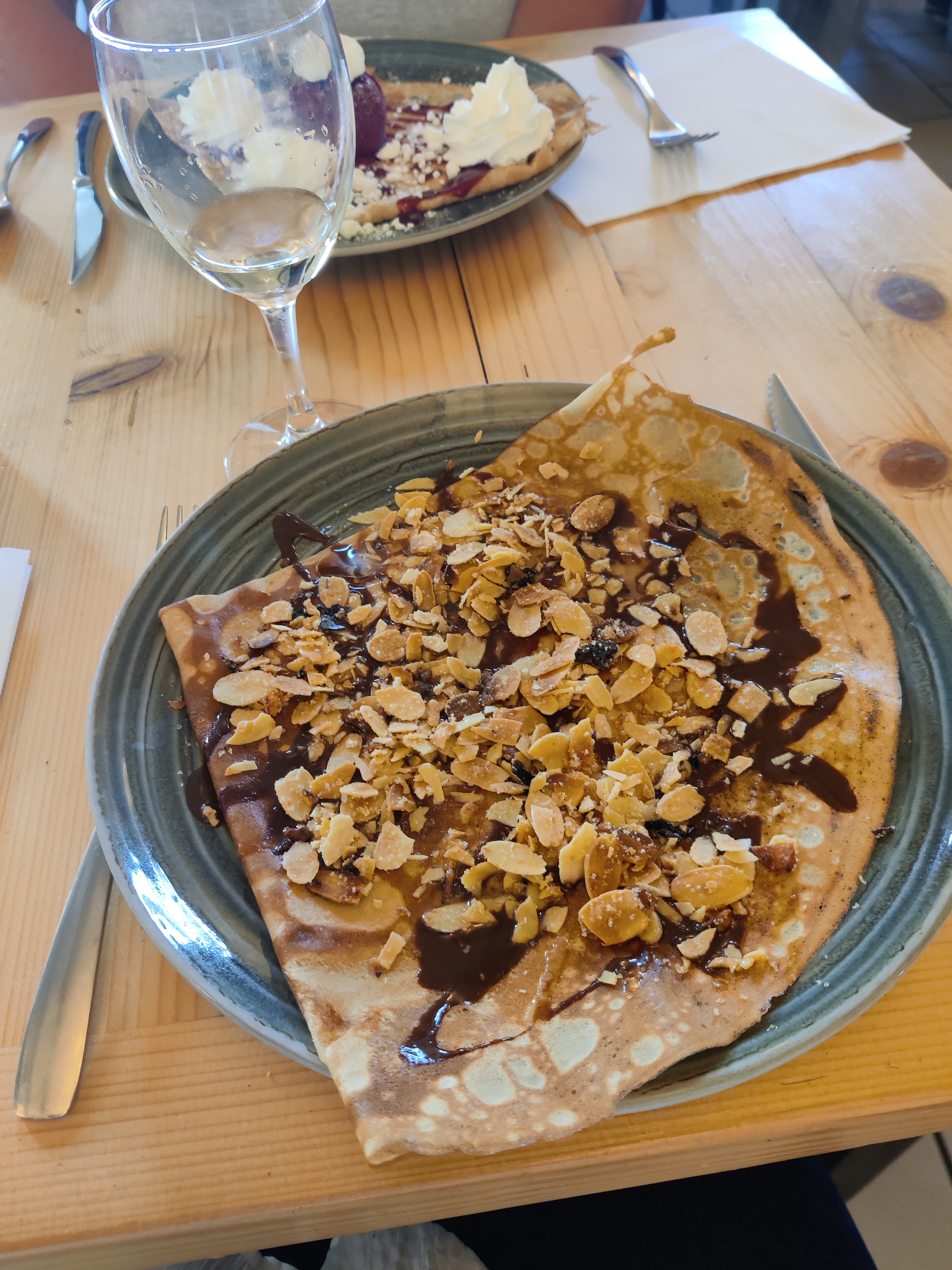 Dommage que ma crêpe chèvre/magret était froide. Les proportions sont correctes mais si vous êtes bin mangeur, prenez une entrée avant la crêpe. Les desserts glace sont bof et la présentation pas appétissante. Ne vaut pas la crêperie La frégate mais comme les prix sont raisonnables et qu'il n'y a pas beaucoup d'autre choix dans le coin, peut convenir. Attention malgré tout, il faut réserver.