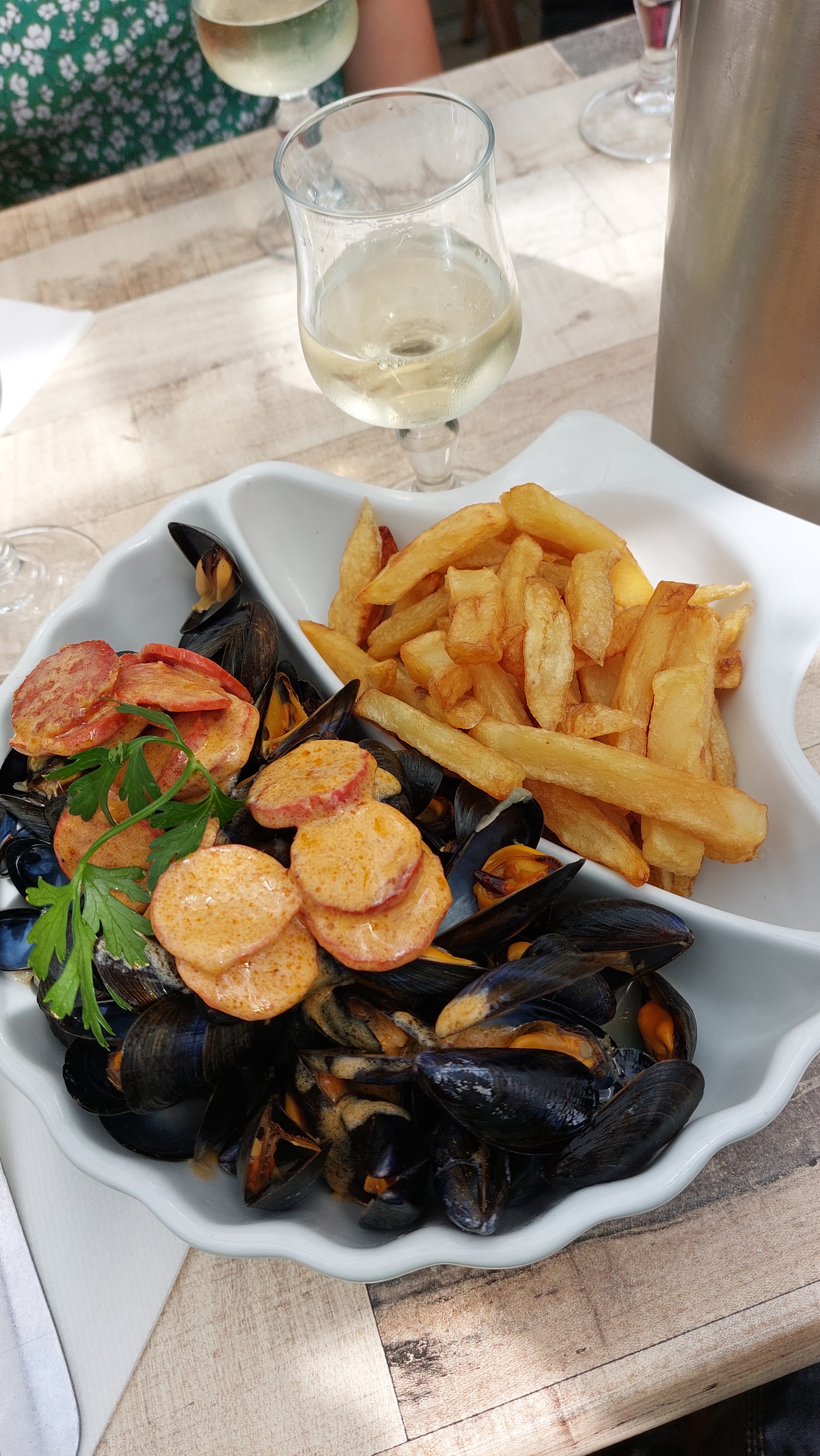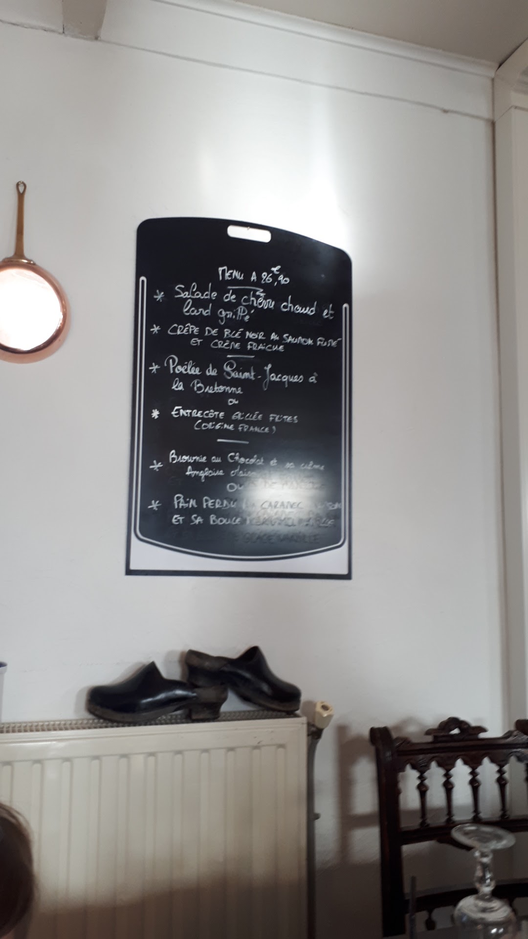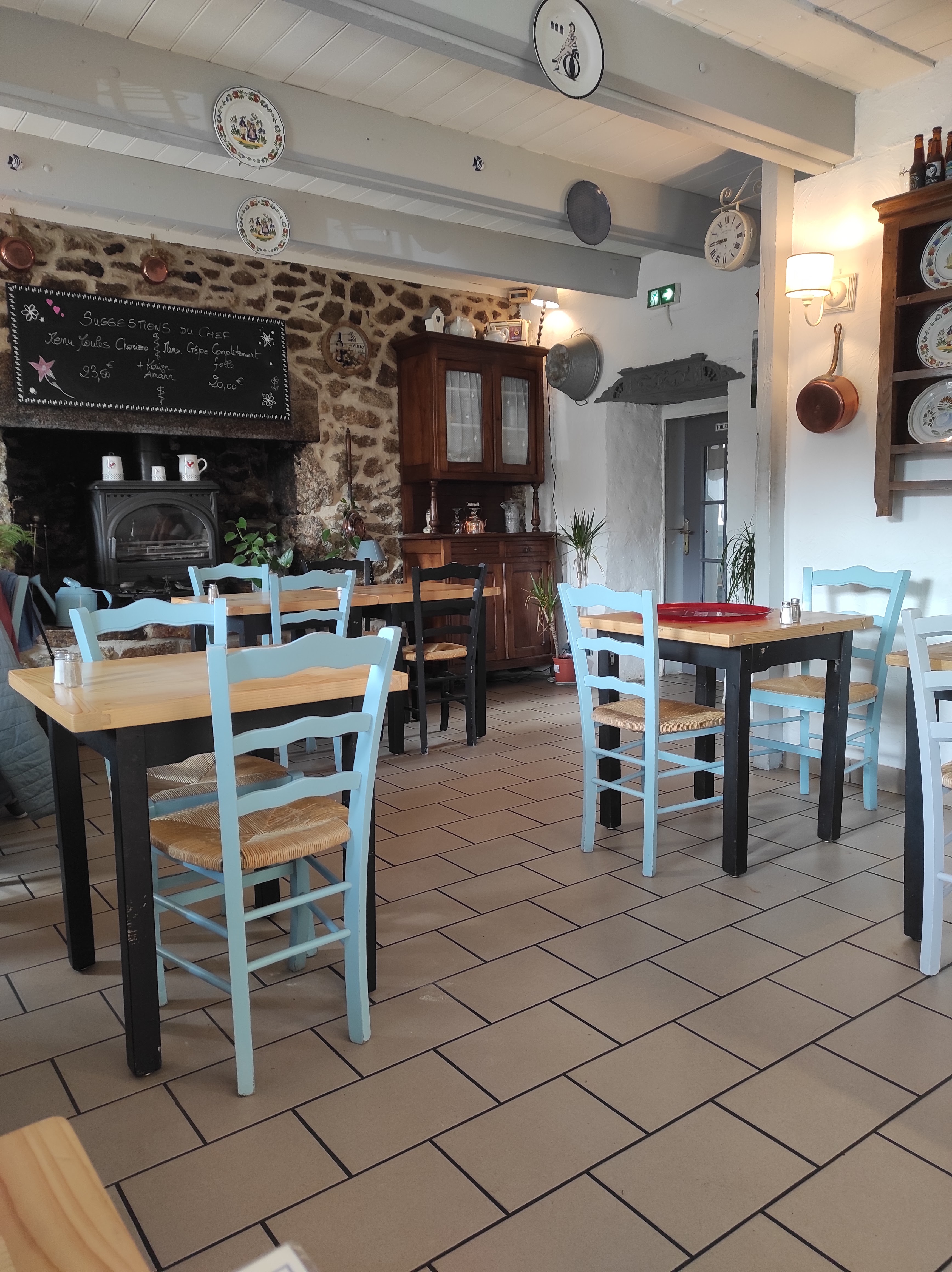Accueil très chaleureux. Décor d'antan magnifique avec tous ces objets anciens. J'ai pris la suggestion du chef : moules au chorizo servies avec des frites maison. La qualité et la quantité étaient dans l'assiette. Pas de regret : c'était délicieux. Je recommande ce petit restaurant-crêperie. Sur les tables voisines, les crêpes étaient appétissantes également.