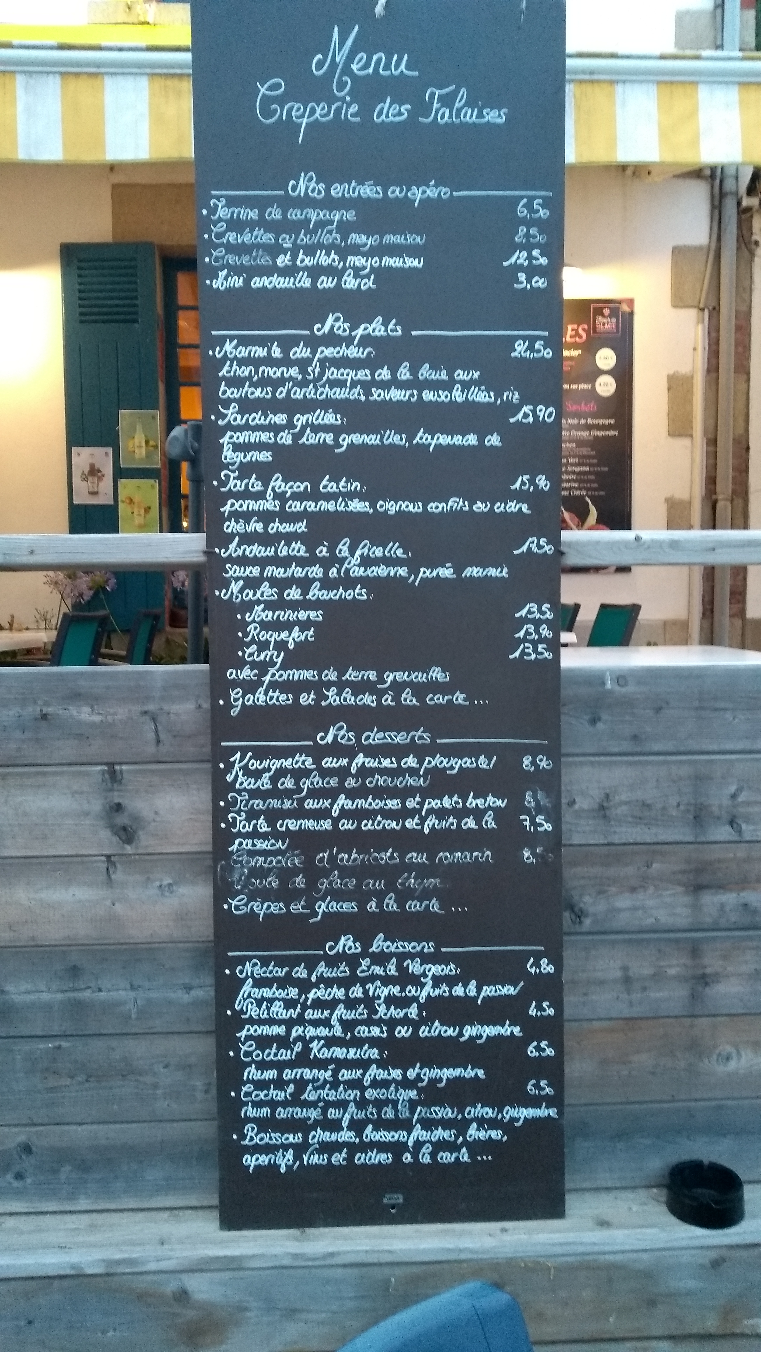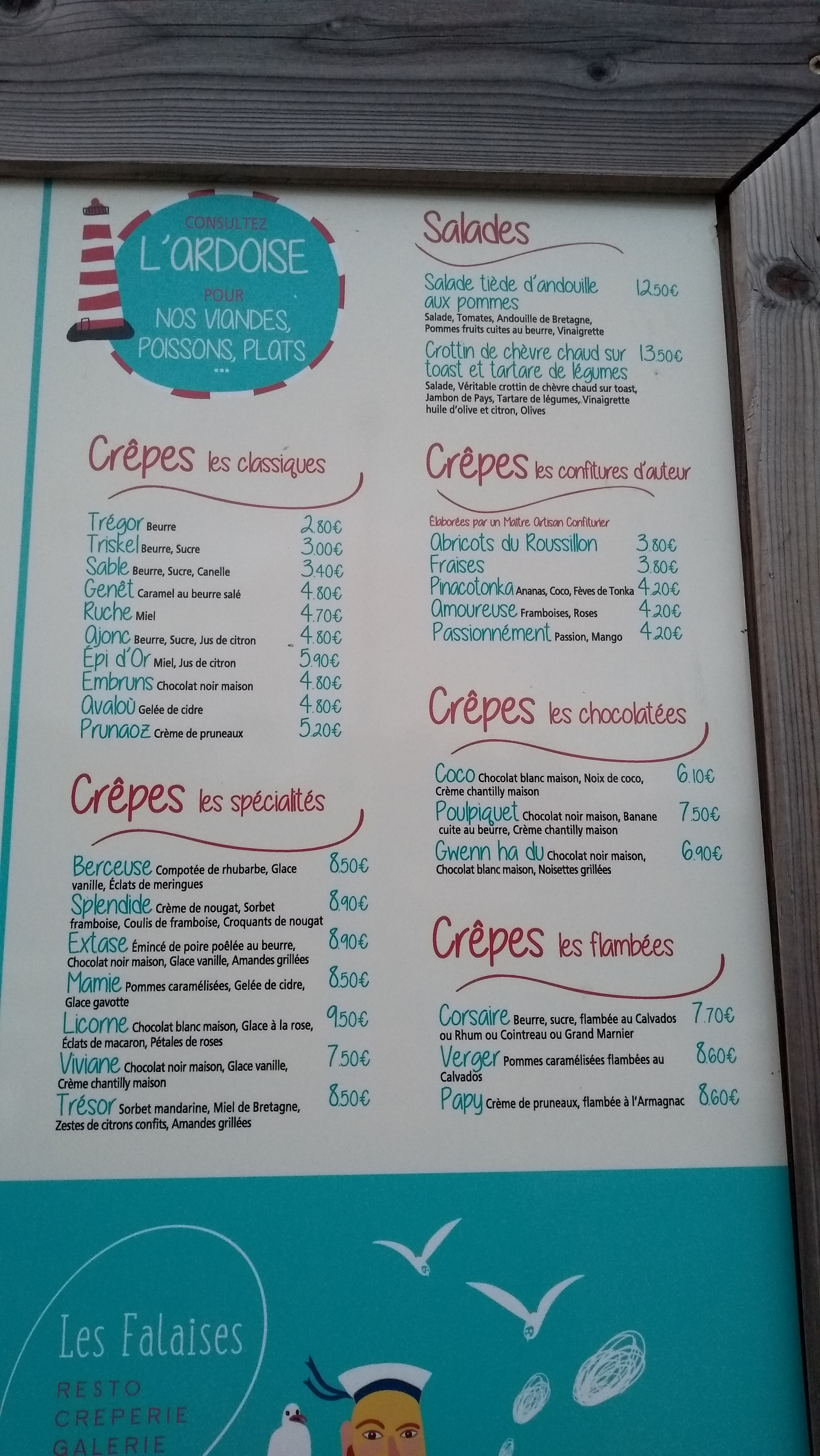 N'ayant pas réservé chez Paulette, nous nous somme rabattus sur le restaurant les falaises. Accueil sympathique et enjoué, certes ce ne sont pas les meilleures crêpes que nous ayons mangées en Bretagne mais c'était très correct. Une crepe salées, une sucrée et une pinte de bière pour 21 euro. Nous avons passé une agréable pause déjeuner
