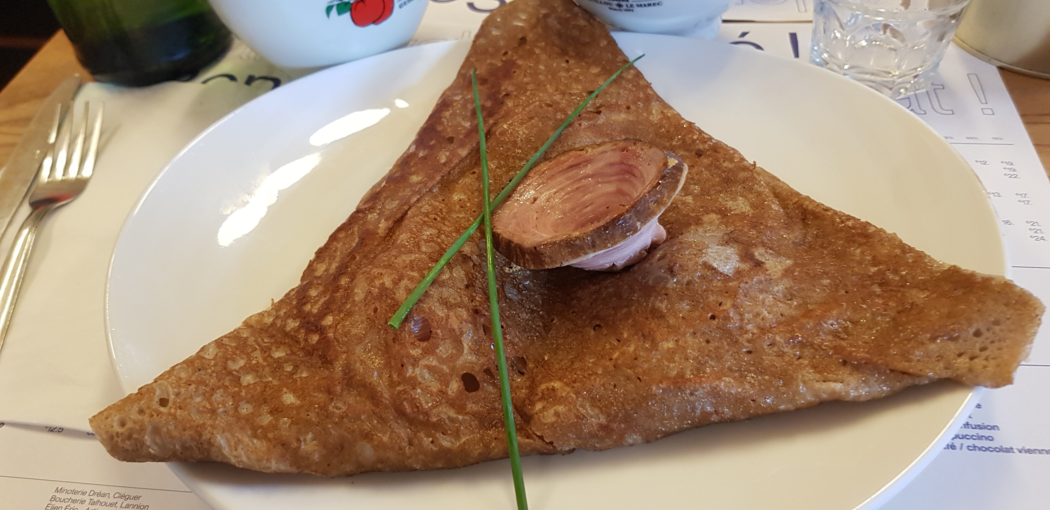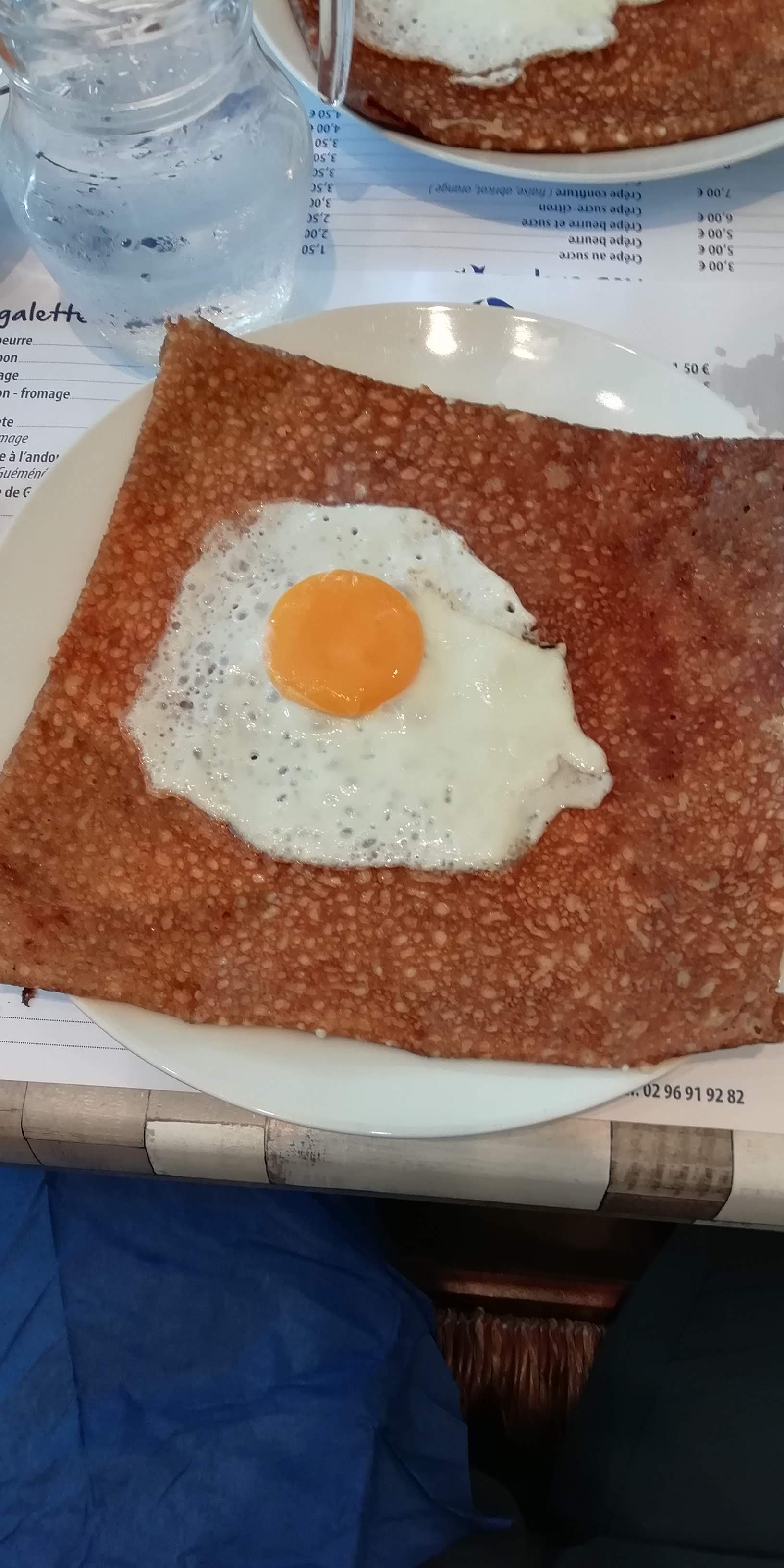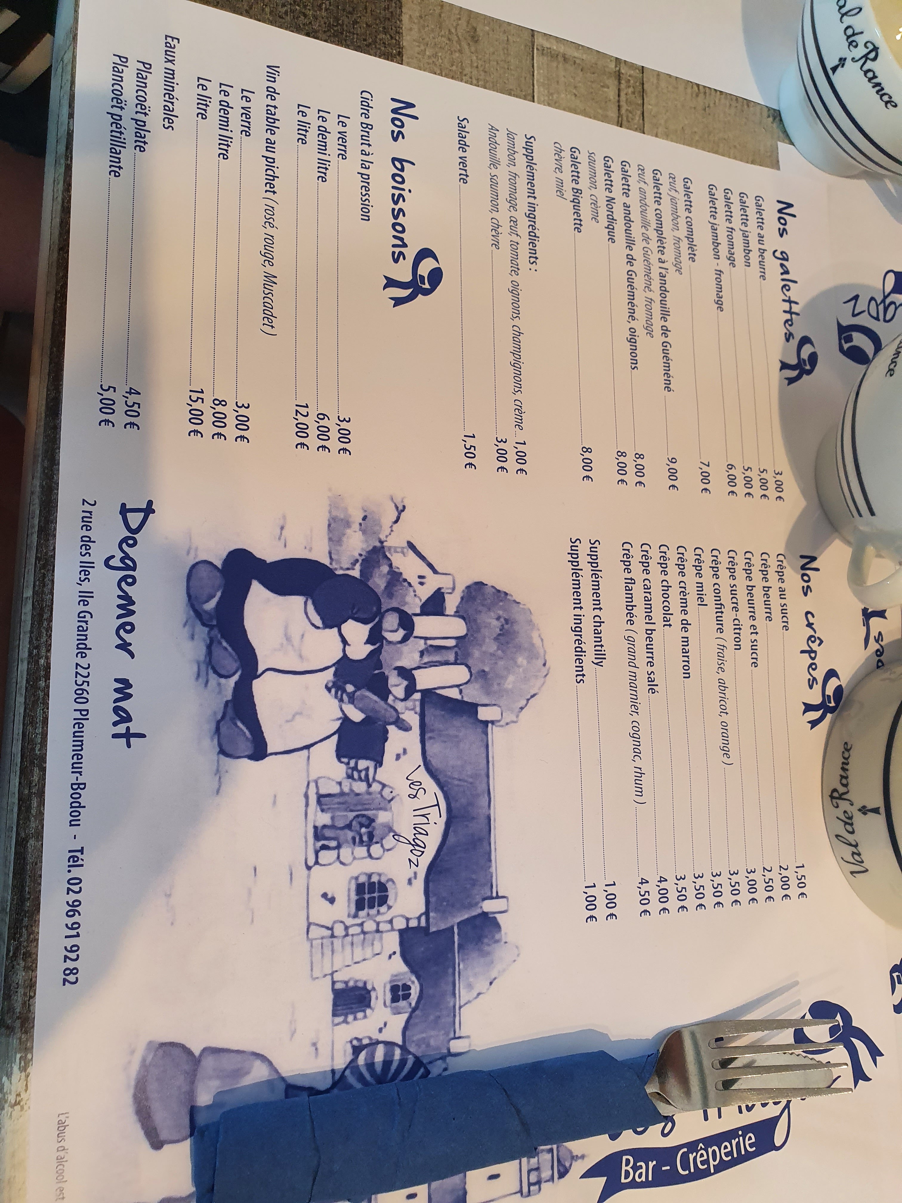 On ne fait pas dans la finesse ! Cette crêperie a attiré notre attention quand nous sommes passé devant la veille au soir, nous avons donc décidé d'y revenir manger le lendemain car l'endroit avait l'ait sympa.... On attend patiemment une bonne dizaine de minute (largement) la vérification de nos pass sanitaire... un serveur au look de militaire en vacance fini par nos accorder une table très étroite à 4. Côté déco, rien n'a bougé depuis les années 60 dirons-nous, c'est plutôt vieillot et un brin ringard... Côté carte, tout est sur le set de table et la encore rien n'a été revu depuis l'ouverture, il y a des années, on a du basique de chez basique, aucune originalité ne vient égayer la carte et le choix est des plus modeste ( voir photo) et dans une gamme de prix plutôt élevée. Le serveur a l' electroencephalogramme plat prend la commande sans un mot ni un sourire... La patronne nous amène les galettes assez rapidement sans beaucoup plus d'expression. Et c'est là que la déception commence vraiment, les garnitures mal réparties, l'andouille coupé façon bûcheron, des tranches d'un 1/2 cm a peine cuites, ce qui devait être un régal s'avère rapidement écœurant... quand on vend des galettes à ce prix là, on peut faire quelques efforts non ? 1 crêpe sucrée pour la petite avec un supplément chantilly à 1€ pour de ma chantilly en bombe sur 1 côté de la crêpe et 1 café... ma CB tousse quand je vois la note... 64€ pour 4 galettes, 1 crêpe, 1 pichet de cidre et 1 café, le tout sans un sourire et sans aucune finesse, cette crêperie restera notre plus mauvais souvenir breton.