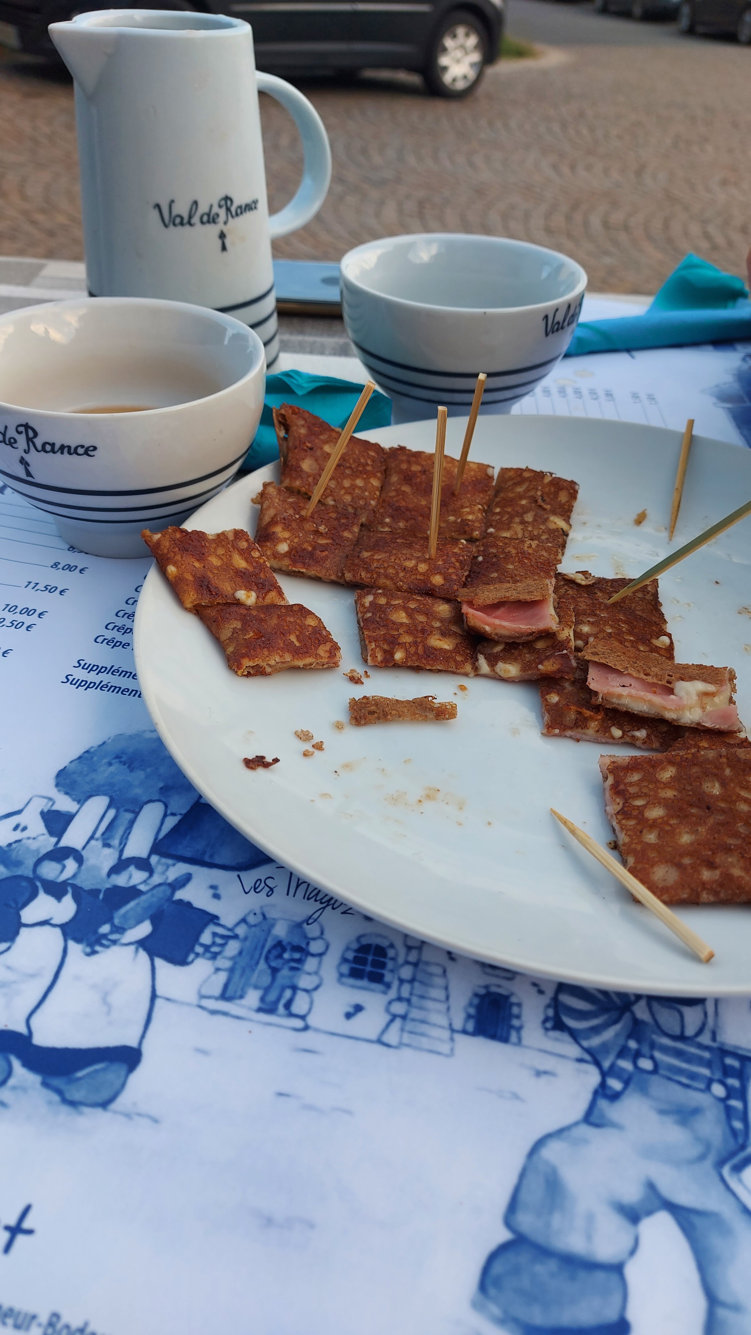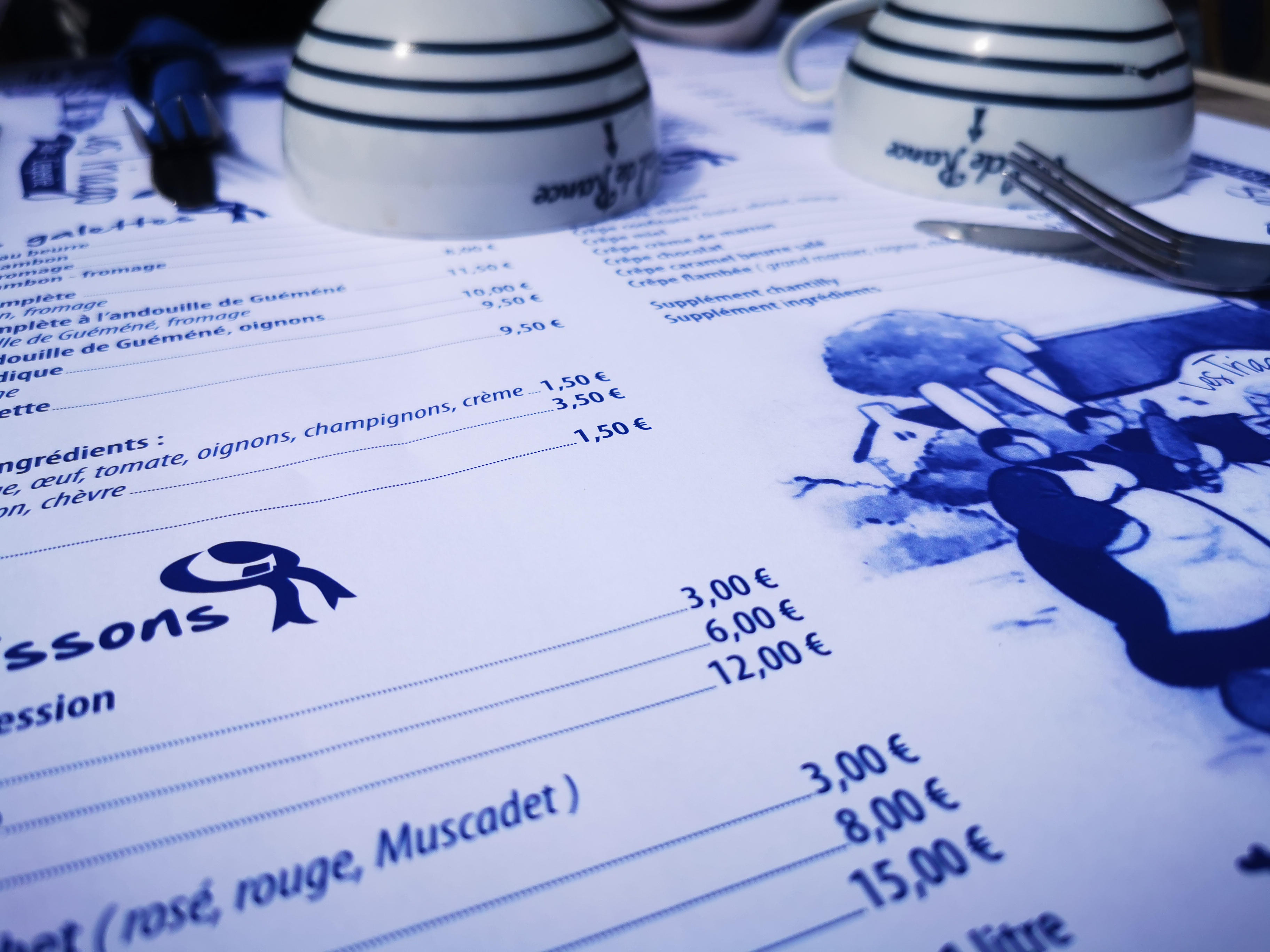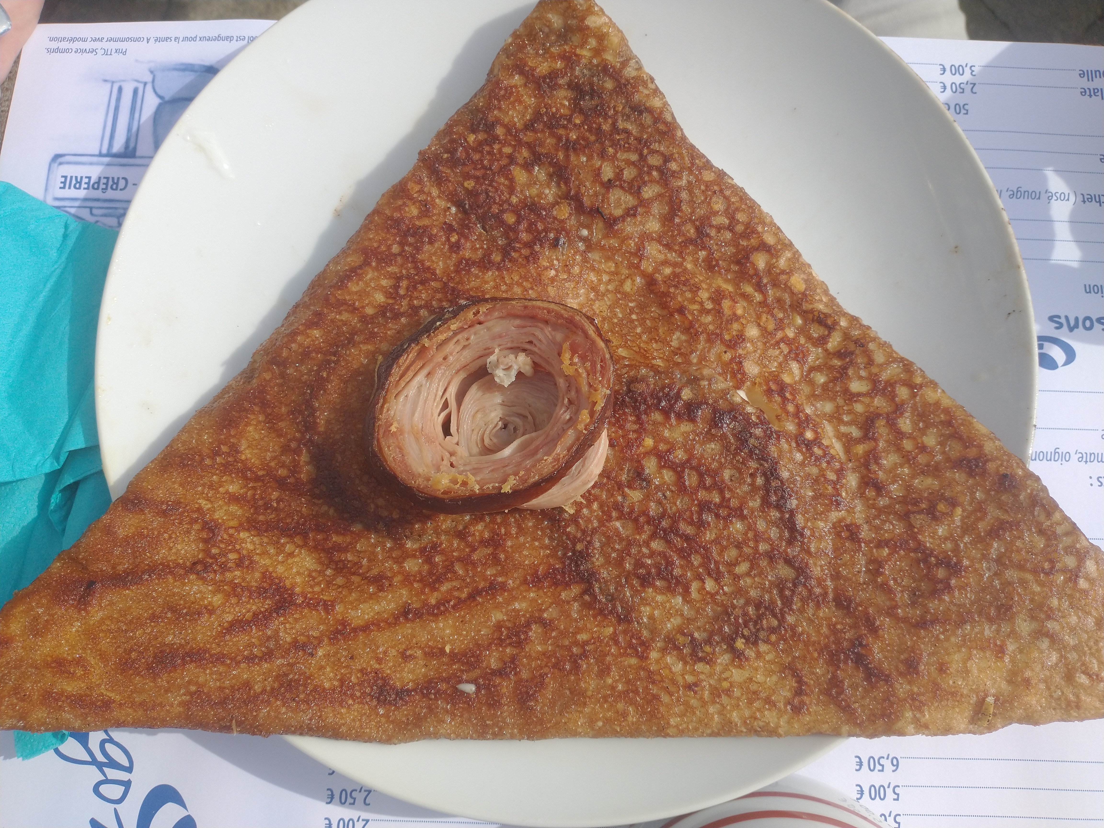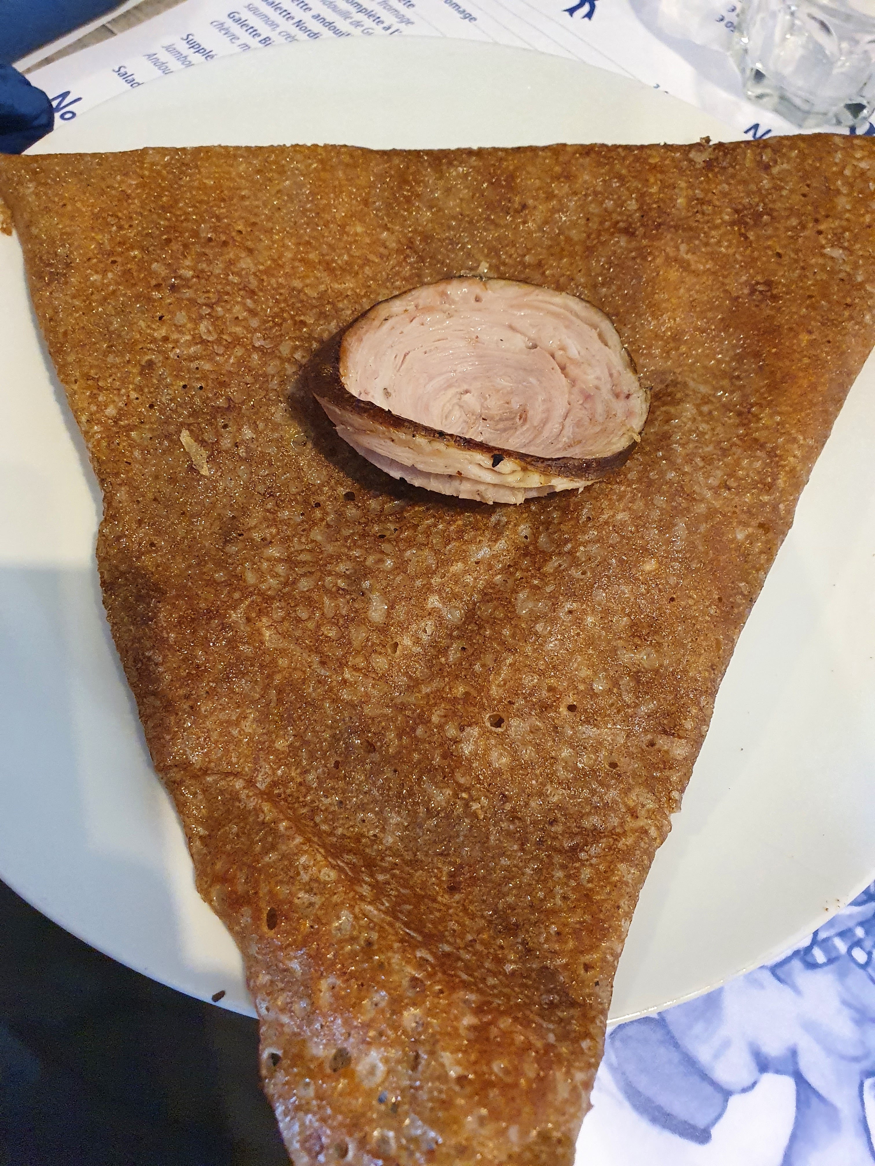 On ne fait pas dans la finesse ! Cette crêperie a attiré notre attention quand nous sommes passé devant la veille au soir, nous avons donc décidé d'y revenir manger le lendemain car l'endroit avait l'ait sympa.... On attend patiemment une bonne dizaine de minute (largement) la vérification de nos pass sanitaire... un serveur au look de militaire en vacance fini par nos accorder une table très étroite à 4. Côté déco, rien n'a bougé depuis les années 60 dirons-nous, c'est plutôt vieillot et un brin ringard... Côté carte, tout est sur le set de table et la encore rien n'a été revu depuis l'ouverture, il y a des années, on a du basique de chez basique, aucune originalité ne vient égayer la carte et le choix est des plus modeste ( voir photo) et dans une gamme de prix plutôt élevée. Le serveur a l' electroencephalogramme plat prend la commande sans un mot ni un sourire... La patronne nous amène les galettes assez rapidement sans beaucoup plus d'expression. Et c'est là que la déception commence vraiment, les garnitures mal réparties, l'andouille coupé façon bûcheron, des tranches d'un 1/2 cm a peine cuites, ce qui devait être un régal s'avère rapidement écœurant... quand on vend des galettes à ce prix là, on peut faire quelques efforts non ? 1 crêpe sucrée pour la petite avec un supplément chantilly à 1€ pour de ma chantilly en bombe sur 1 côté de la crêpe et 1 café... ma CB tousse quand je vois la note... 64€ pour 4 galettes, 1 crêpe, 1 pichet de cidre et 1 café, le tout sans un sourire et sans aucune finesse, cette crêperie restera notre plus mauvais souvenir breton.