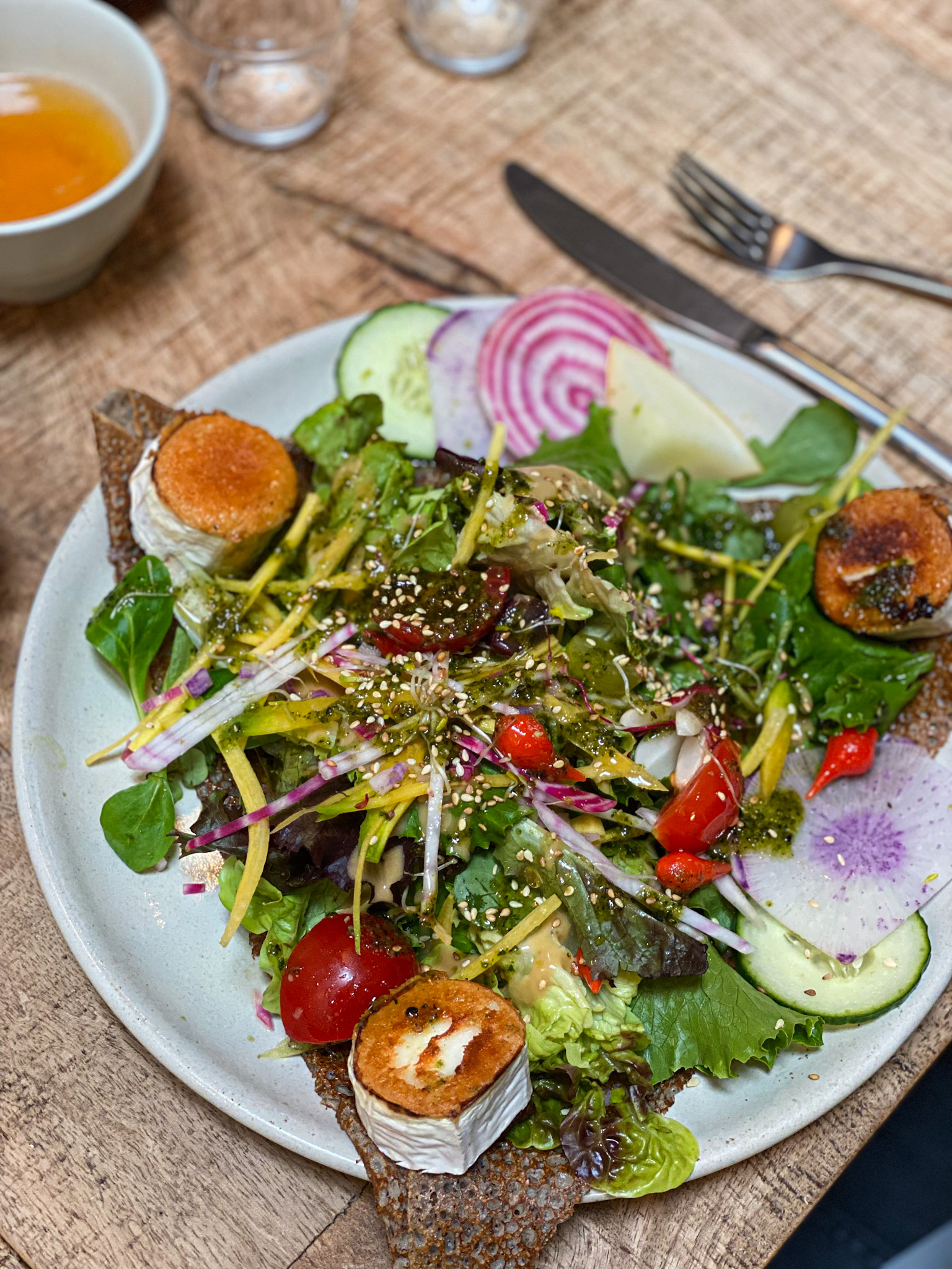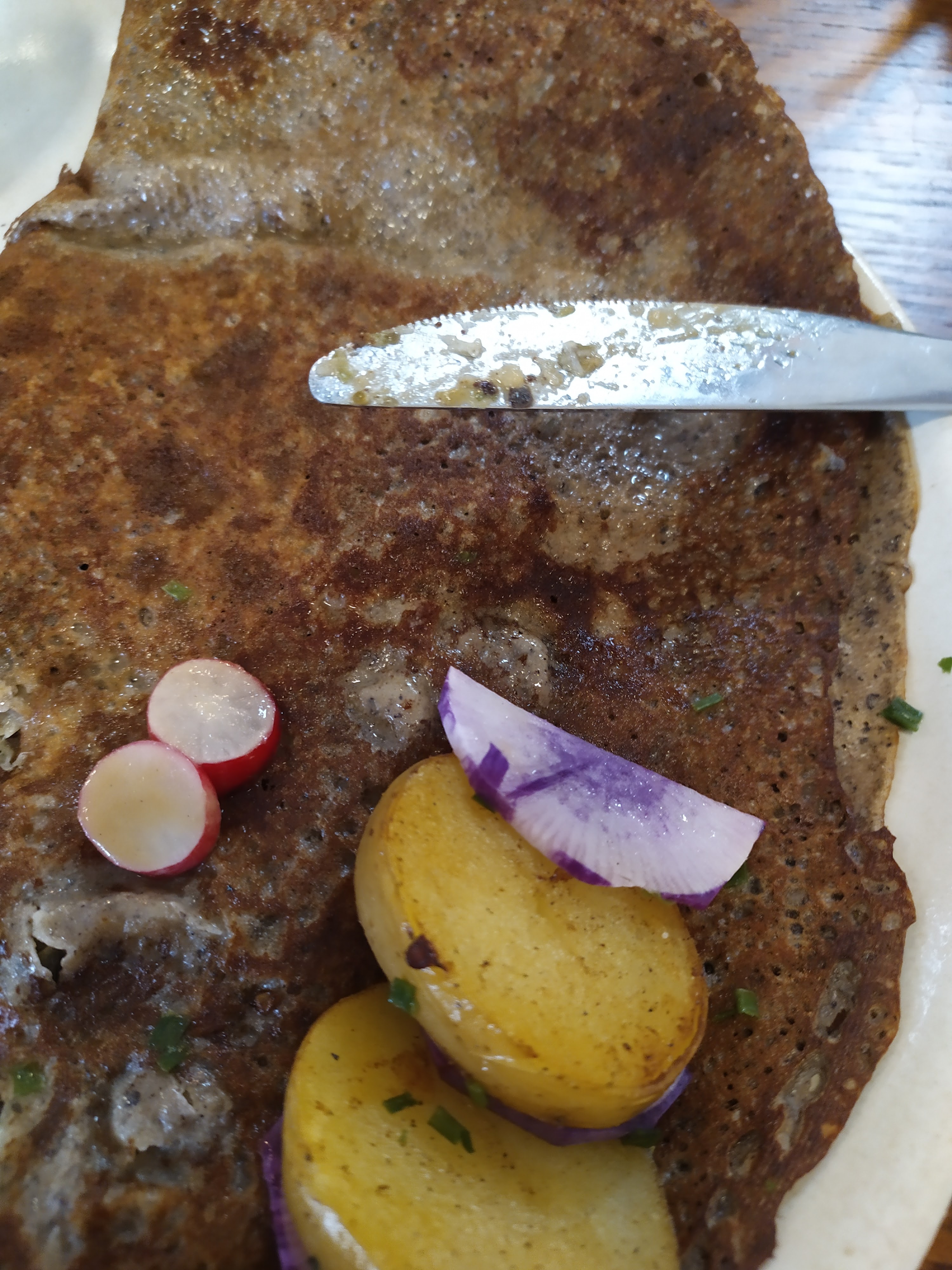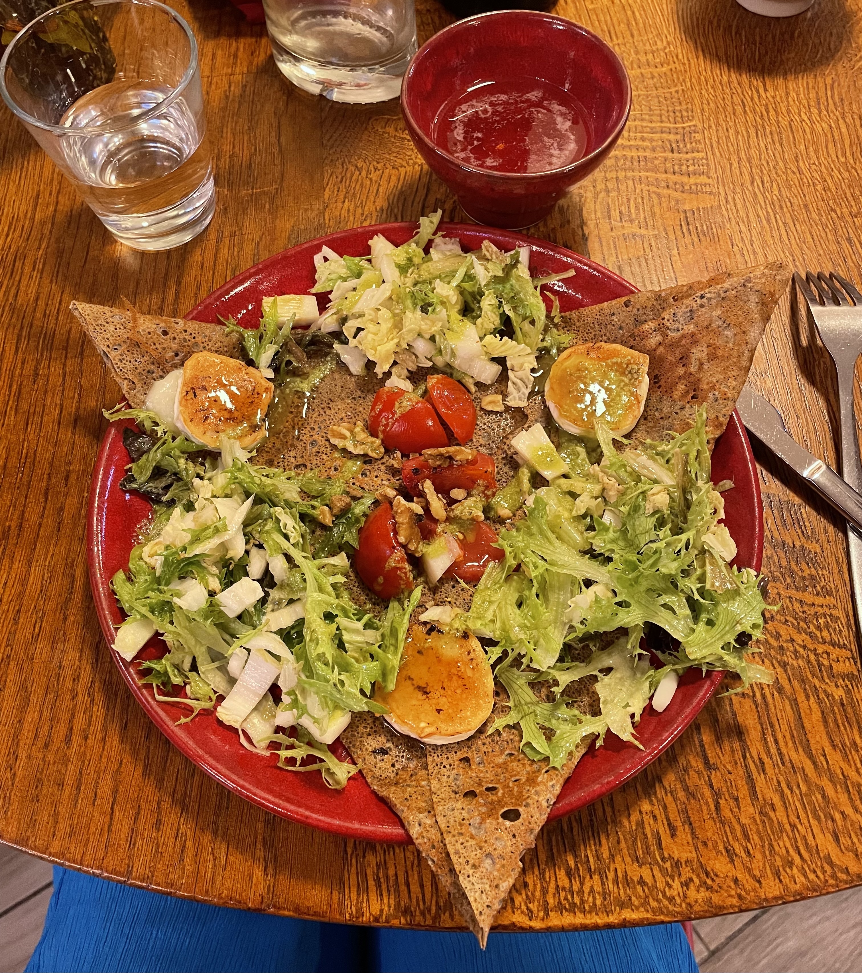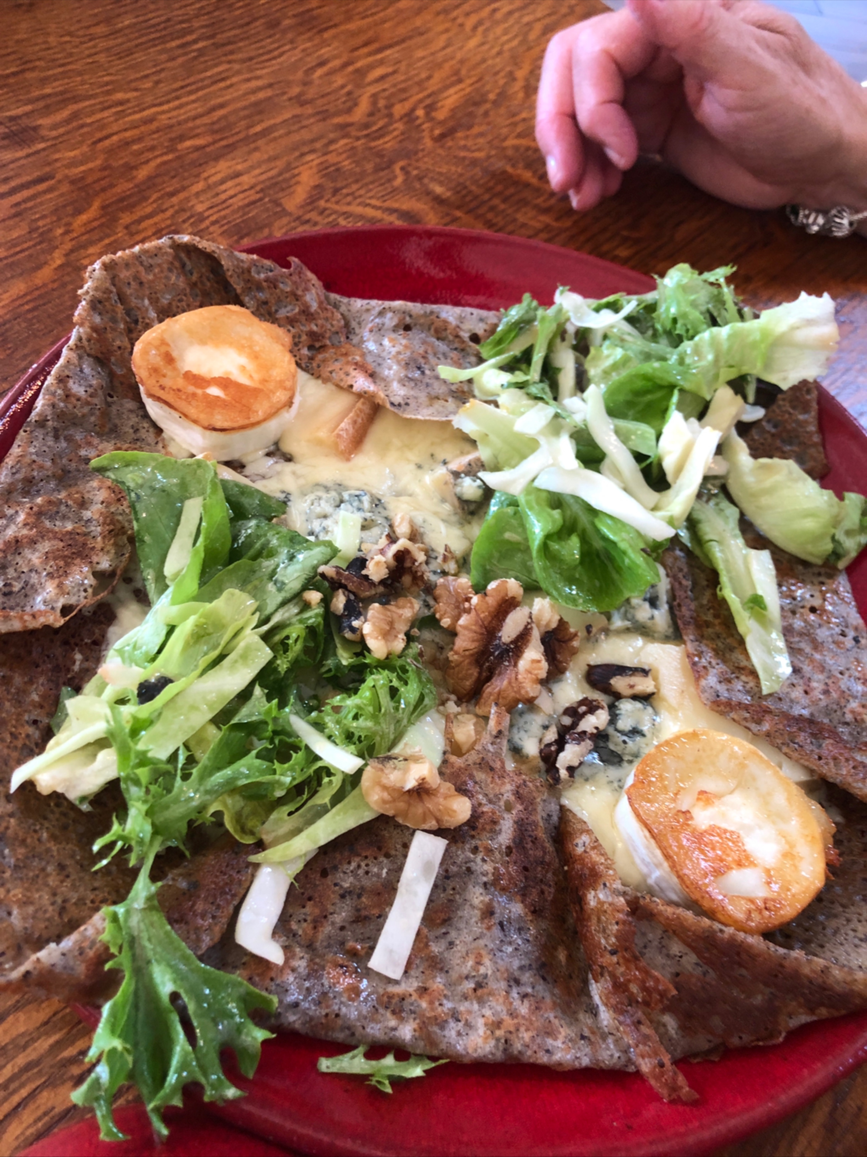 Crêpe a l'artichaut servie froide. Salade pas fraîche dommage pour un jour de marché et 2ème galette trop cuite. Décoration kitche. Service sans chaleur . Bref pas terrible. La cuisinière c'est quand même excusée.