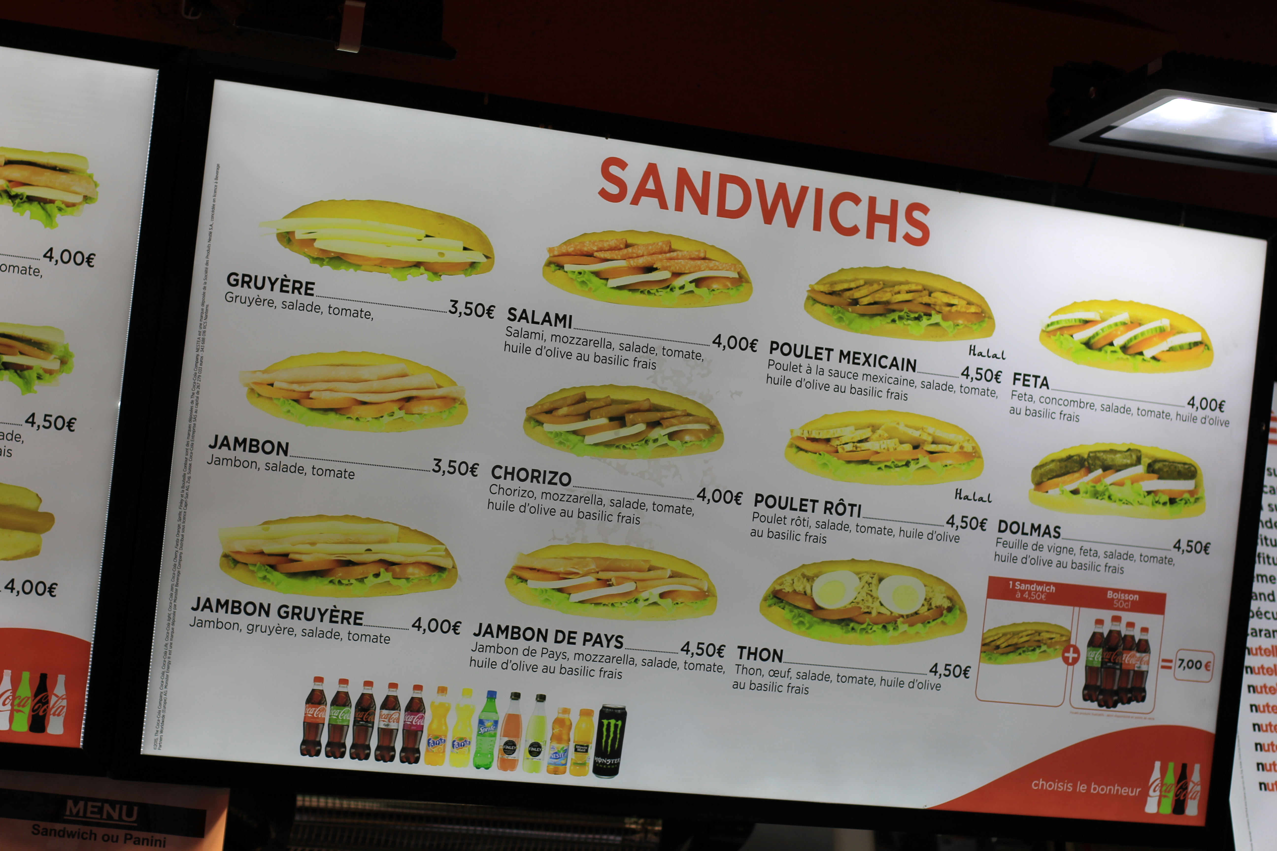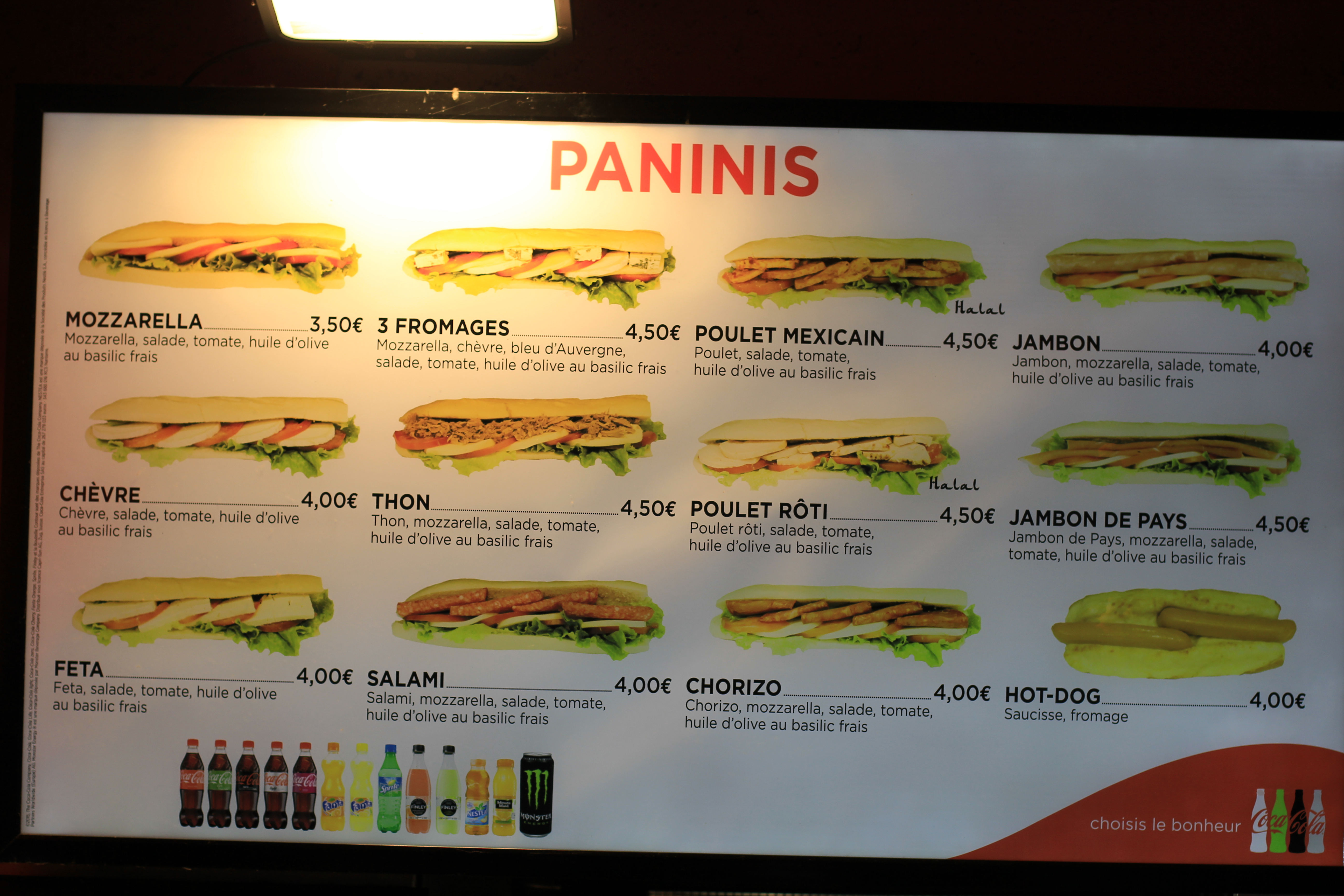 Un panini 3,50-4,50 euros. Pas de place. Paiement carte bancaire accepté.