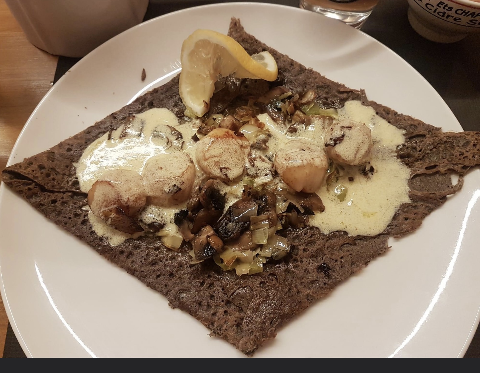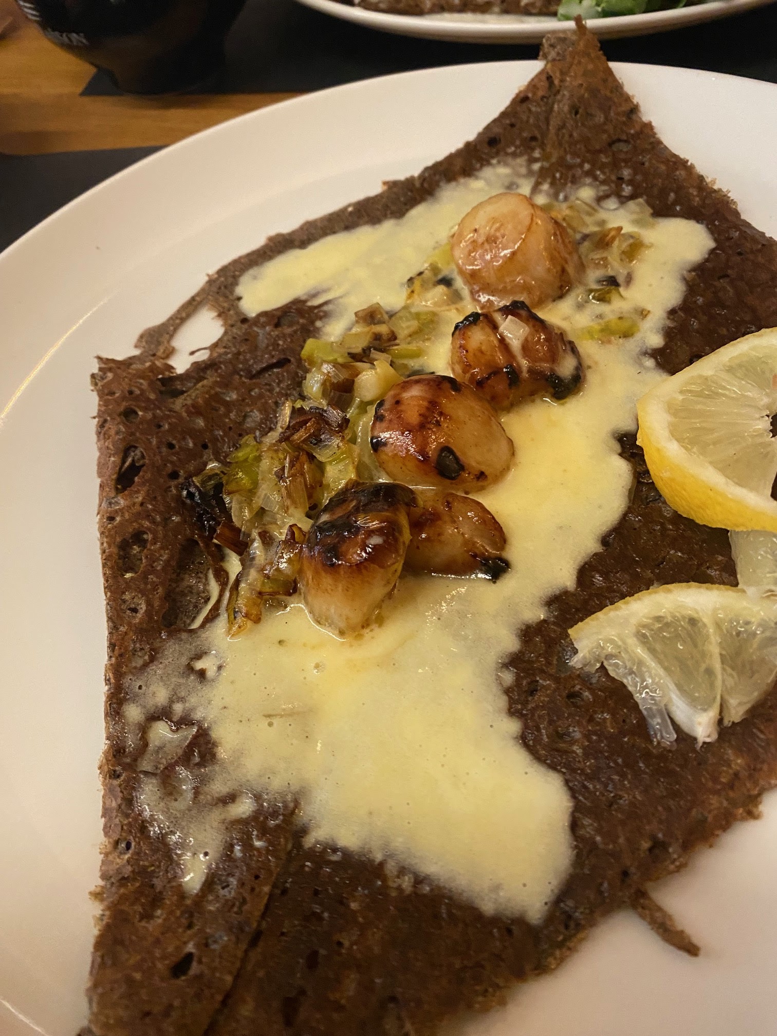 Très bon restaurant. Bon accueil. J'ai pris une crêpe aux Saint Jacques et une crêpe pomme. Crêpes fondantes et très bonnes avec une pointe de sel. Je recommande ++