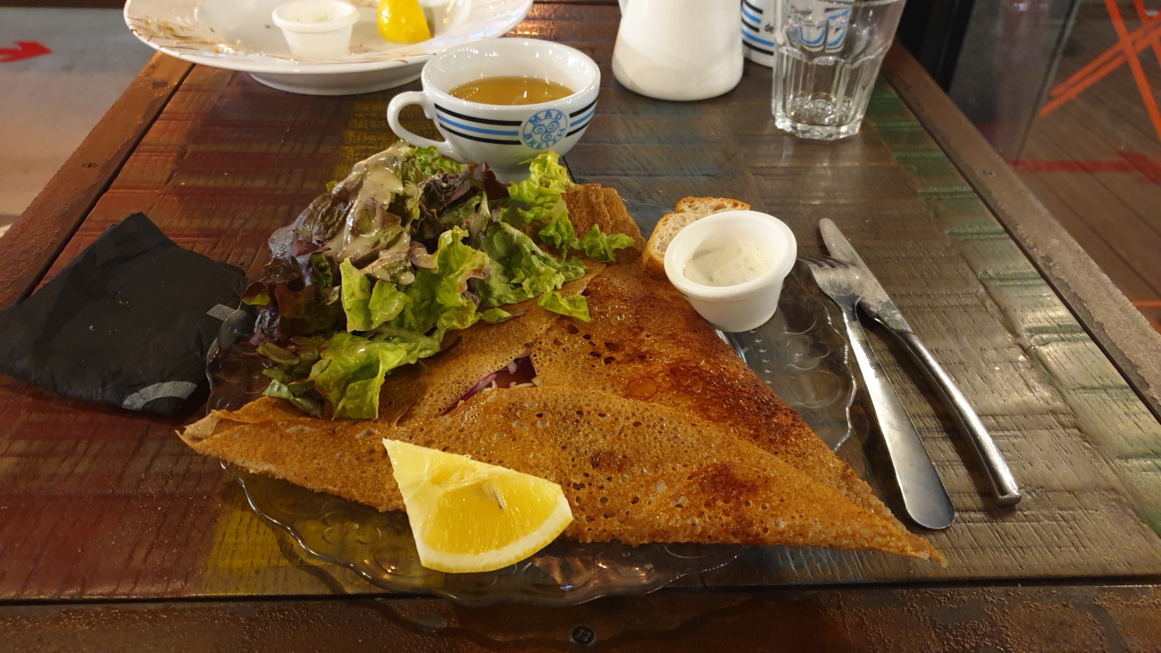 Crêperie avec déco très agréable, les galettes sont originales dans leurs compositions et noms, les crêpes ont un bon goût de beurre, le personnel est très dynamique et simple. Il y a de la place, tables hautes ou basses. Parfait avant une visite de la cité de la voile juste à côté