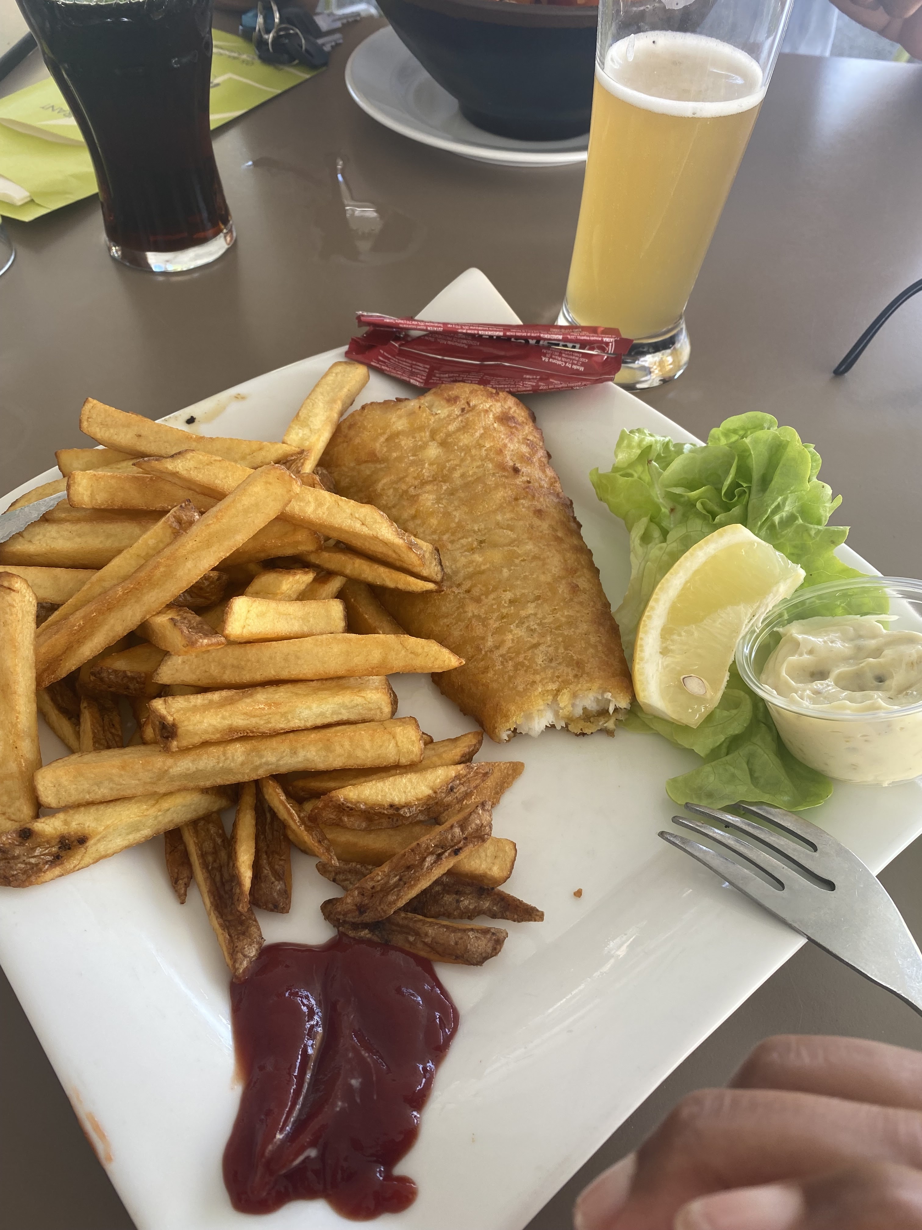 Pas ouf.. Fish and chips goût huile avec petite frite surgelée ⚠️ Attention ⚠️ Femmes enceintes et personnes allergiques... Si vous osez demander une modification de plat ou de menu ça va être très compliqué parce que le chef n'aime pas ça Avec une situation et un cadre pareil c'est vraiment dommage de ne pas être à la hauteur