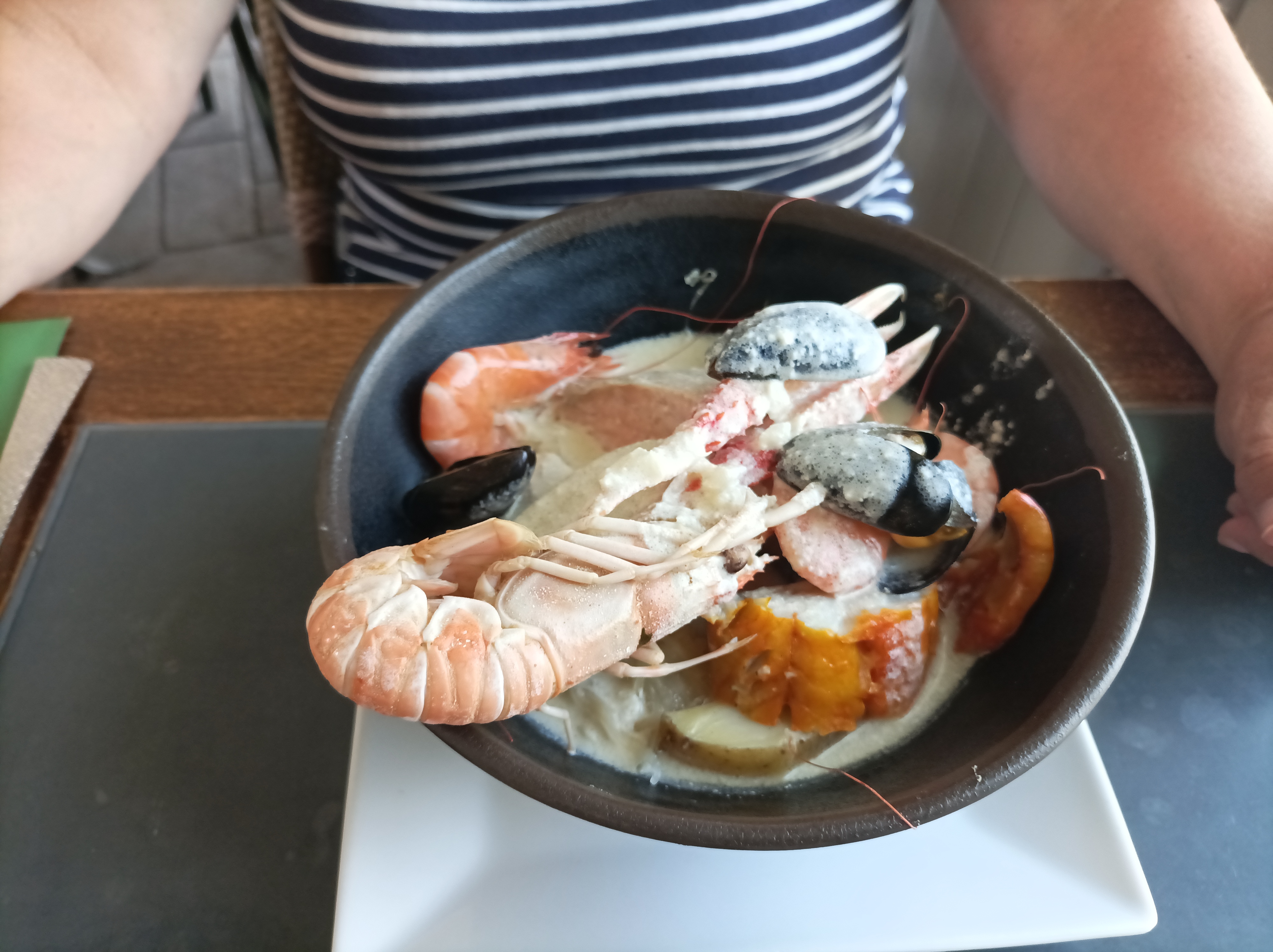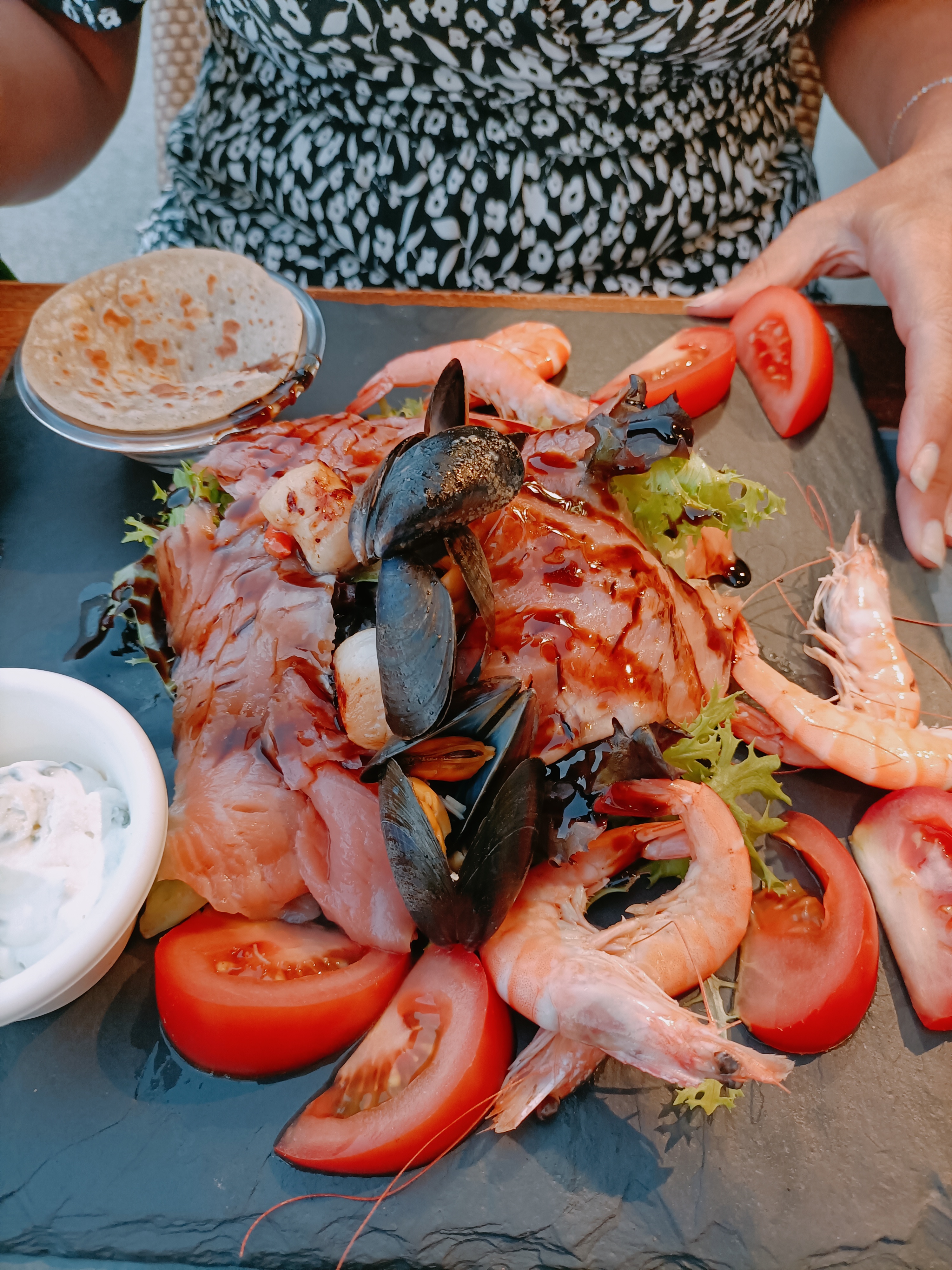 La terrasse est très agréable, le choix de plats varié, nous avons pris la choucroute de la mer avec gambas, moules, haddock, saumon, palourdes, etc… c’était très bon et servi rapidement avec le sourire. C’est une bonne adresse au pied du phare des baleines.