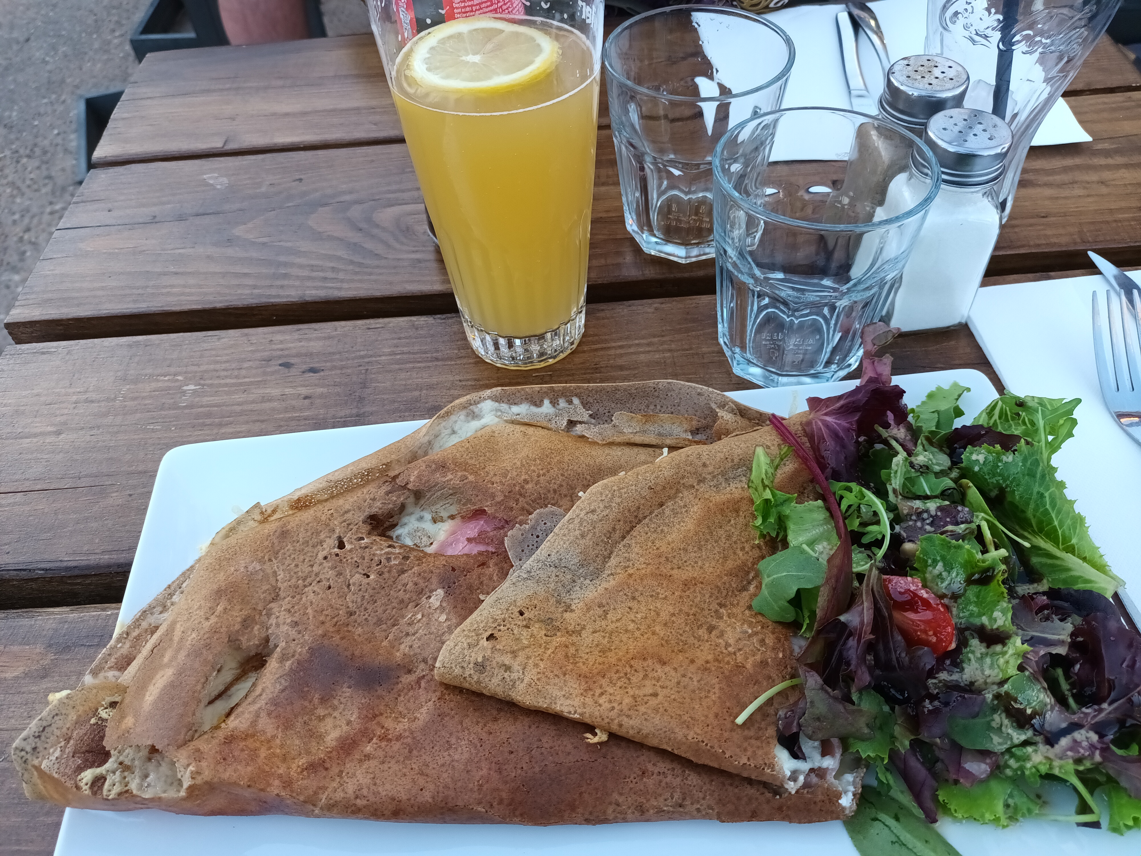 Arrêt improvisé pour deux crêpes de sarrasin et une bolée de cidre. Service super sympa, crêpes délicieuses avec petite salade. Pour un petit creu c’est parfait ! Terrasse pleine en tout début de soirée. Il y en a pour tous les goûts. À soutenir ❤️👏