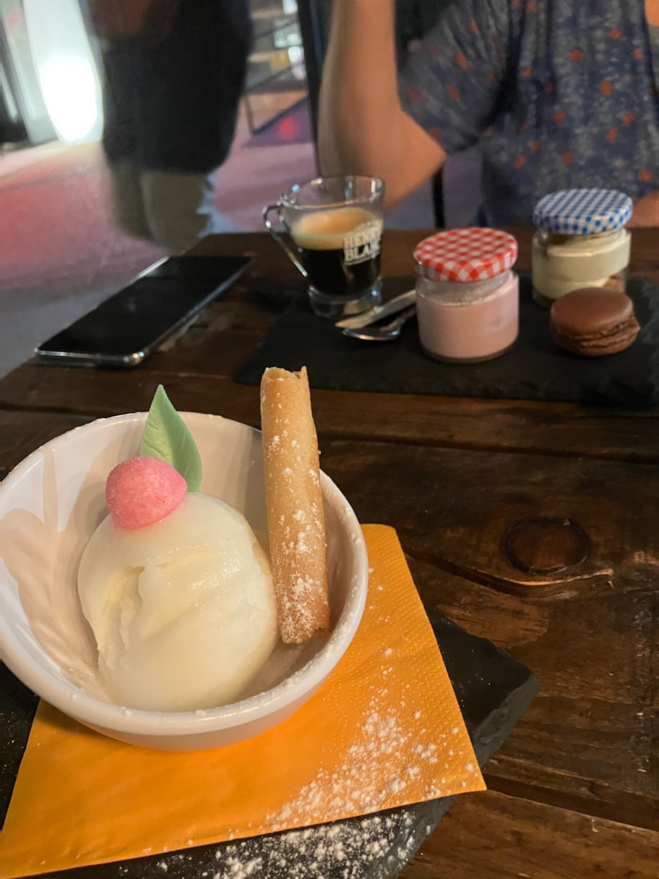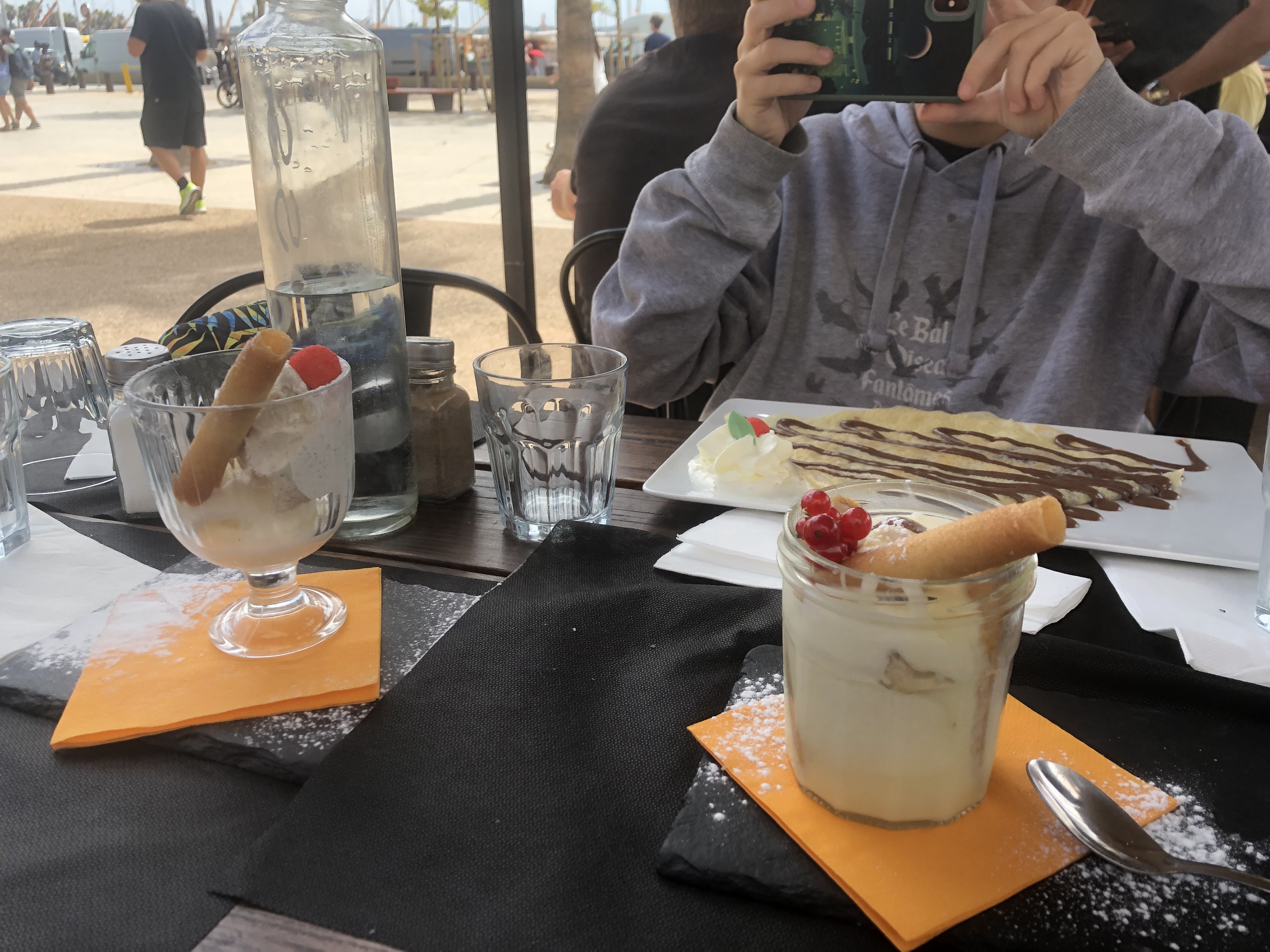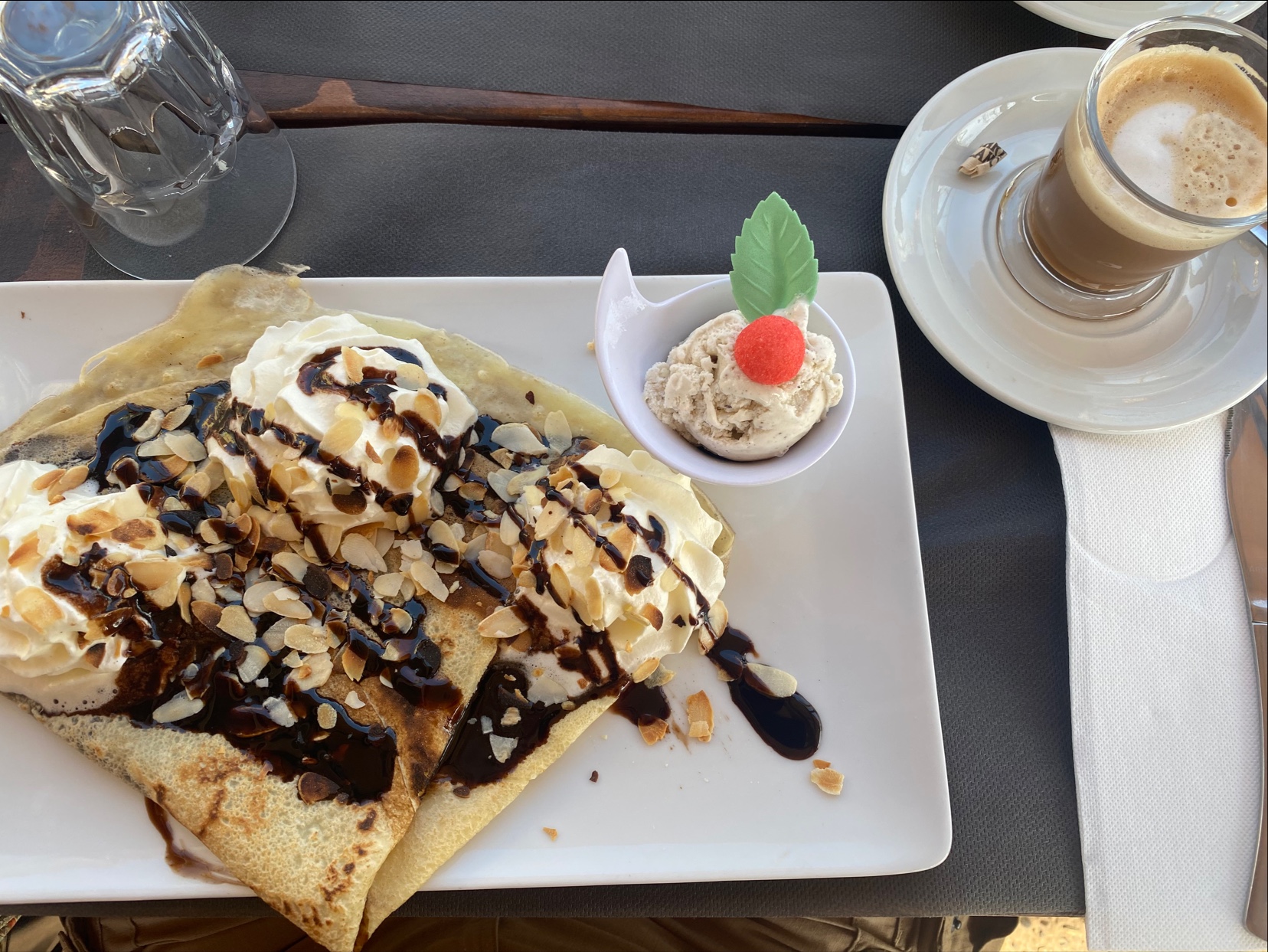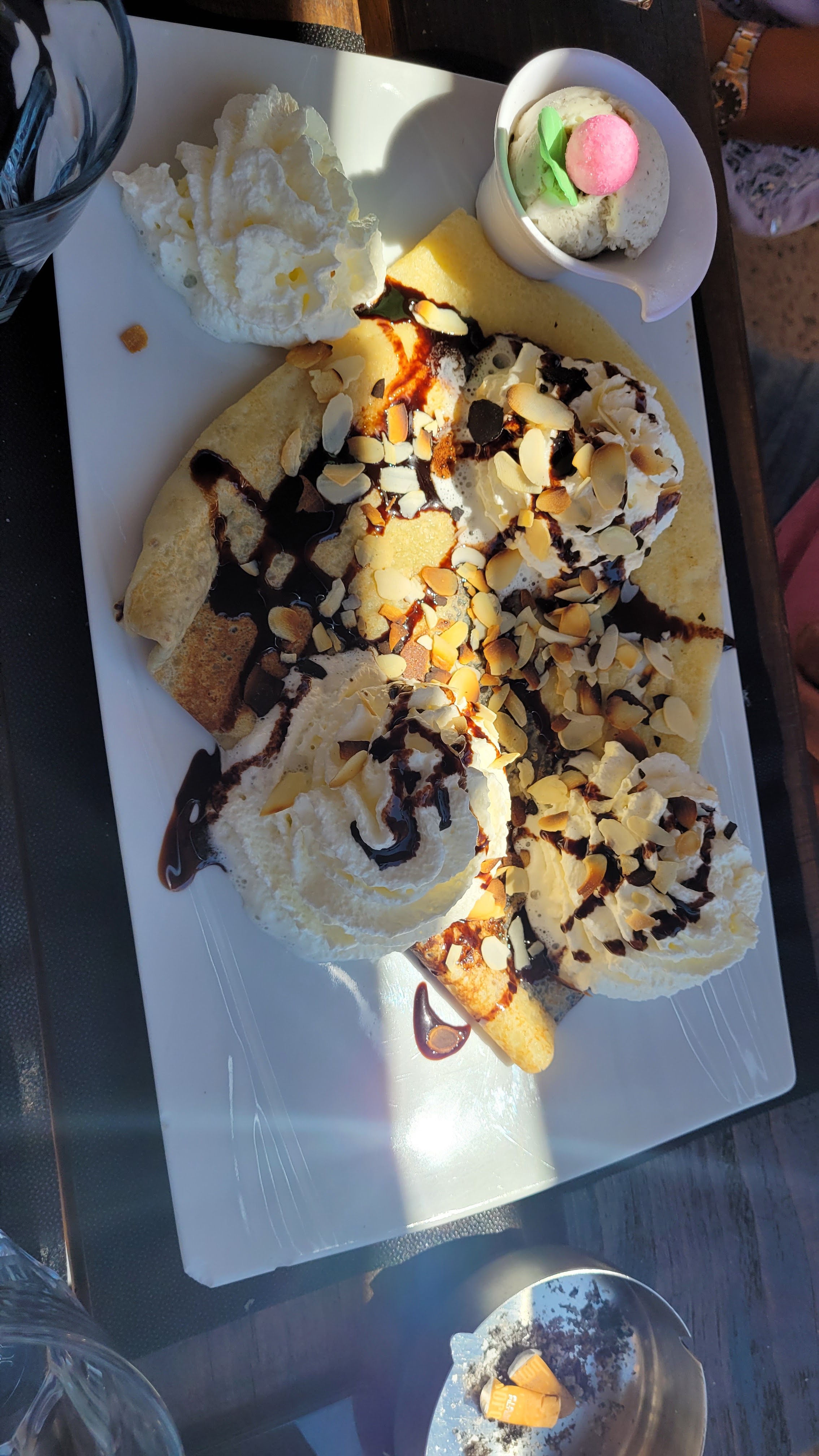 Nous avons mangés deux crêpes, une au nutella et la seconde au marron avec glace marron en soirée. Ces dernières étaient très bonnes et bien garnies malgré que la glace était fondue et qu’il y avait énormément d’amandes grillées. L’équipe du restaurant est très gentille et accueillante. L’endroit face au port est très sympa 😊