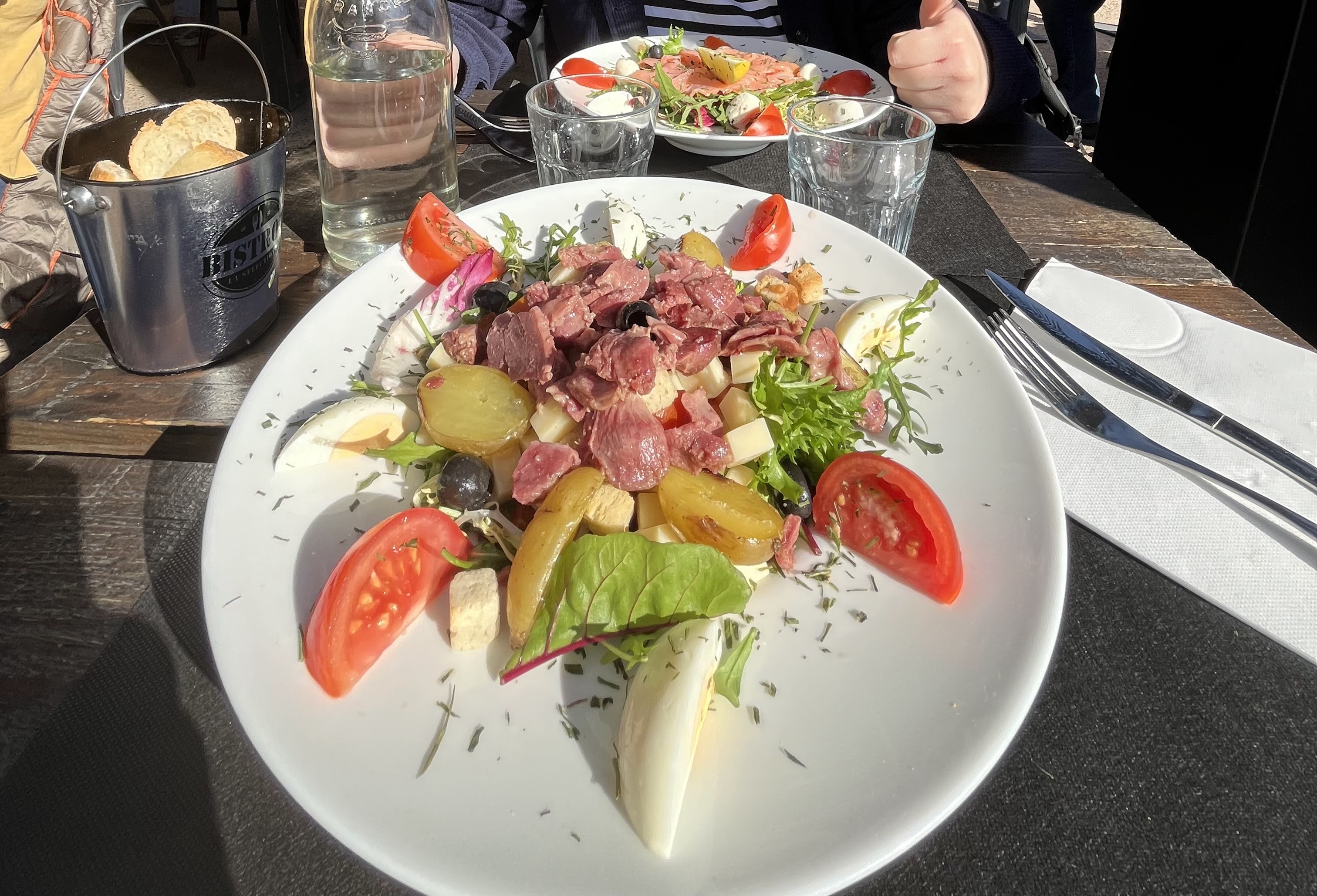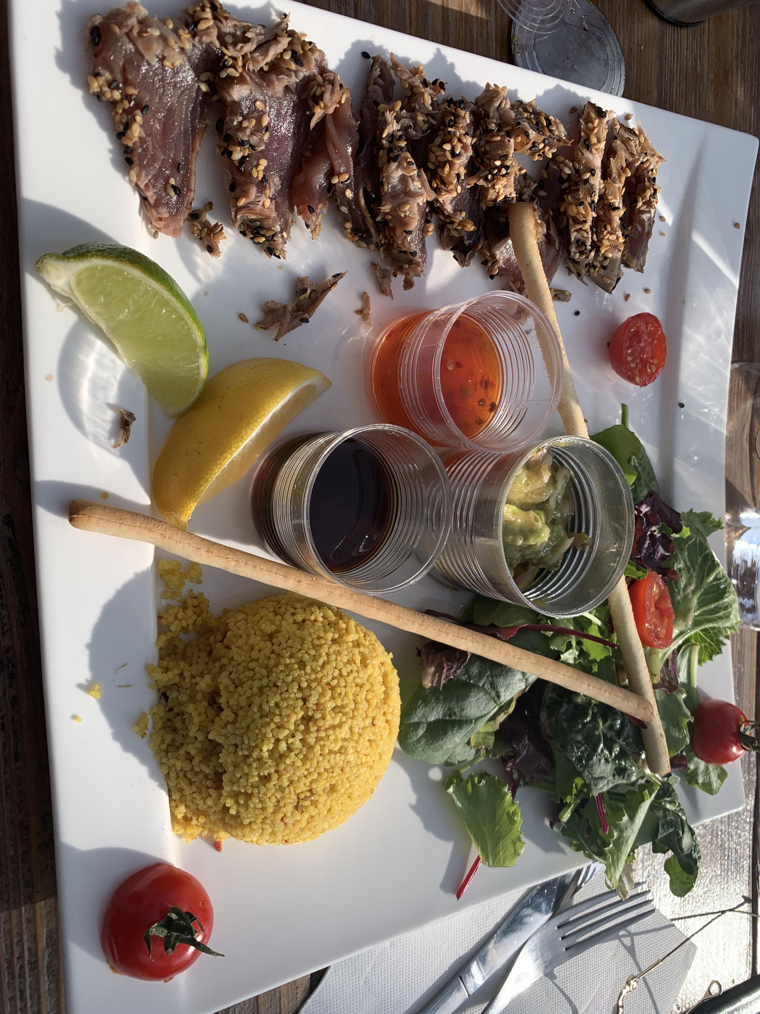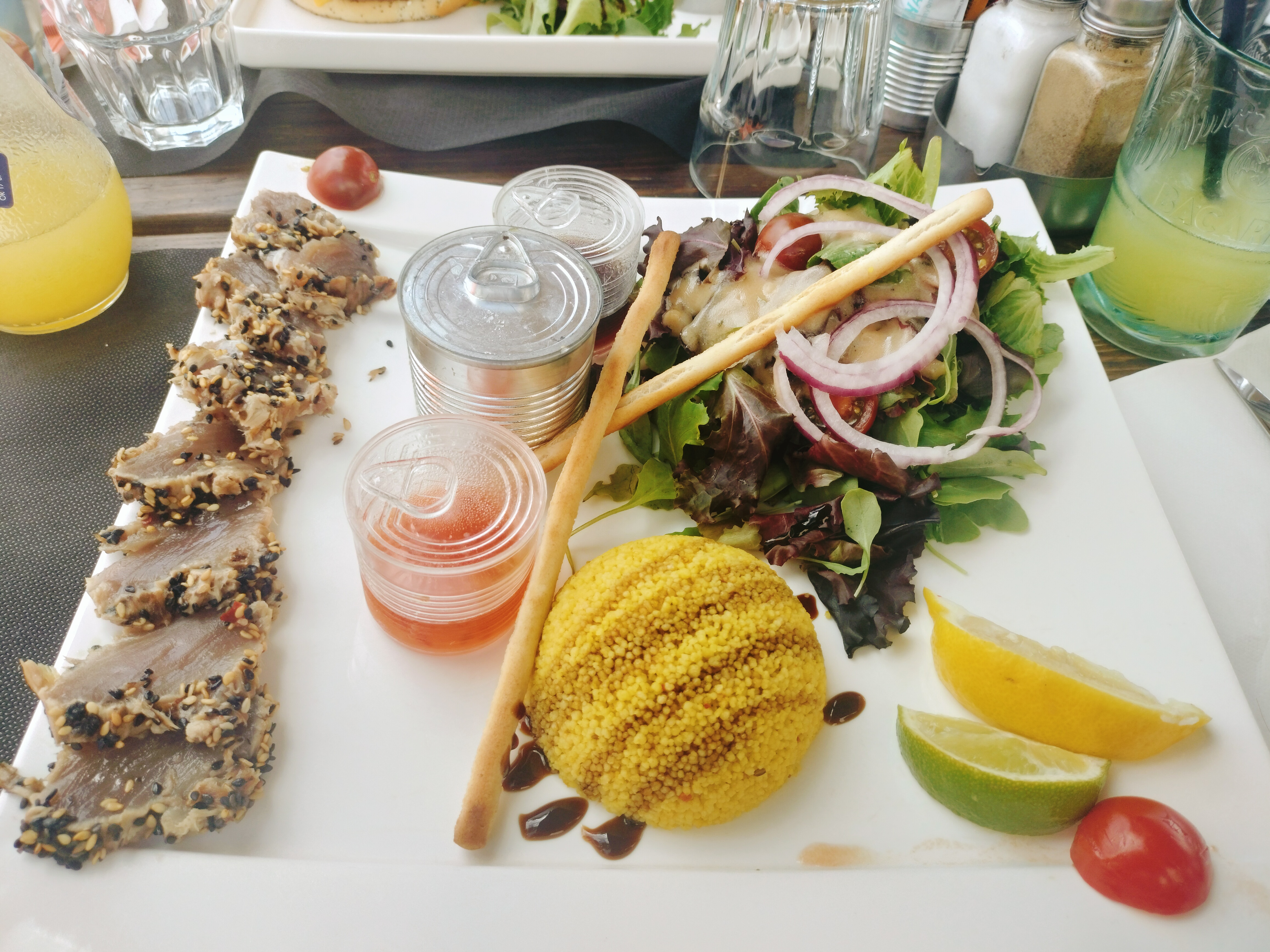 Salade niçoise manger dehors au soleil entre les palmiers face au port. En février c'est très agréable. Salade très correcte, équipe de serveurs jeunes et dynamiques et prix au top, je vous le recommande et bonne continuation sur cette lancée !