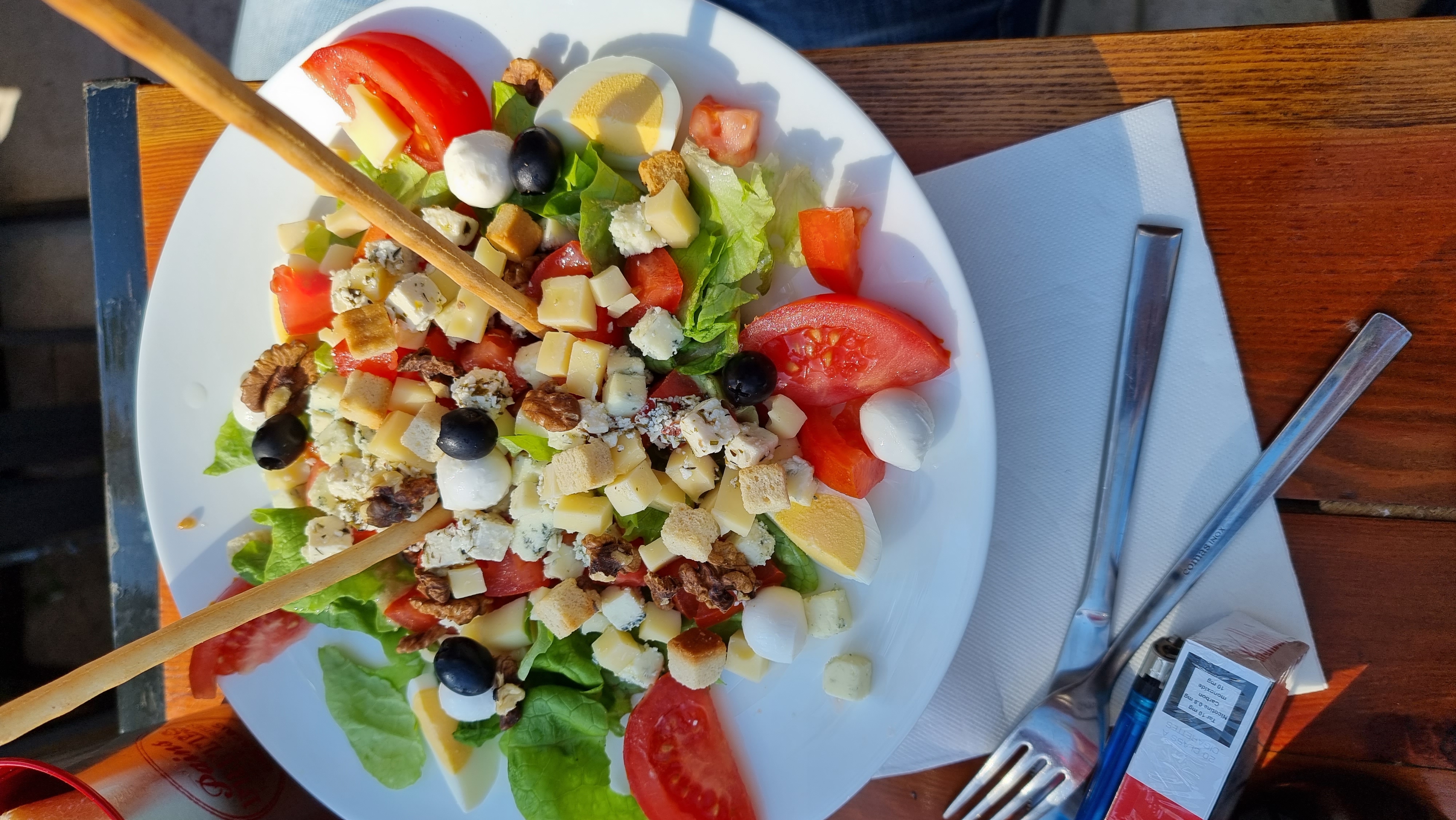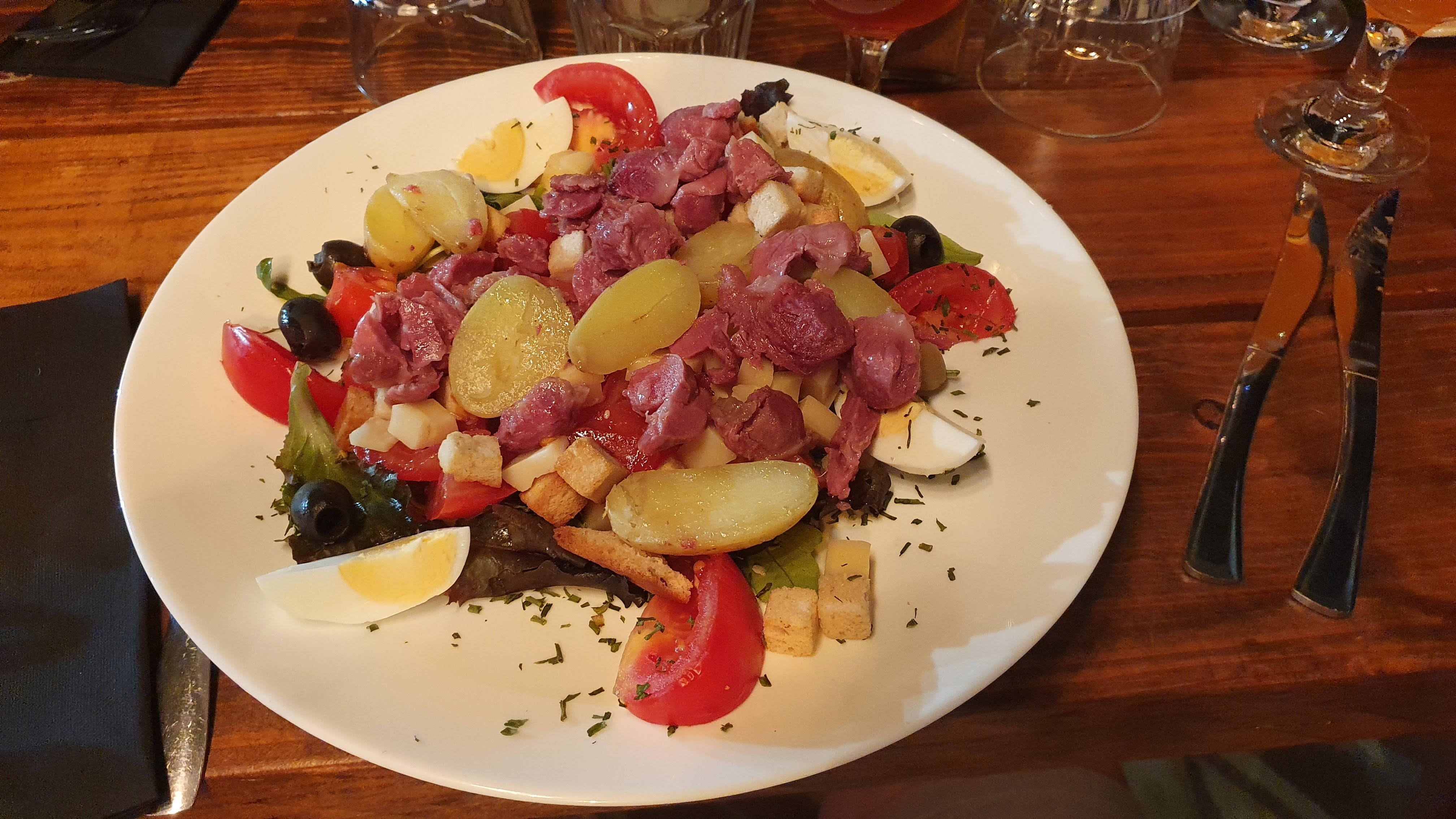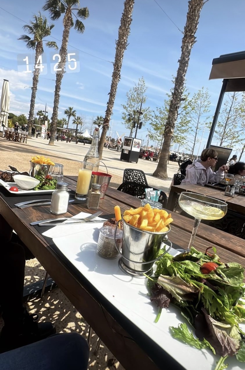 Salade niçoise manger dehors au soleil entre les palmiers face au port. En février c'est très agréable. Salade très correcte, équipe de serveurs jeunes et dynamiques et prix au top, je vous le recommande et bonne continuation sur cette lancée !