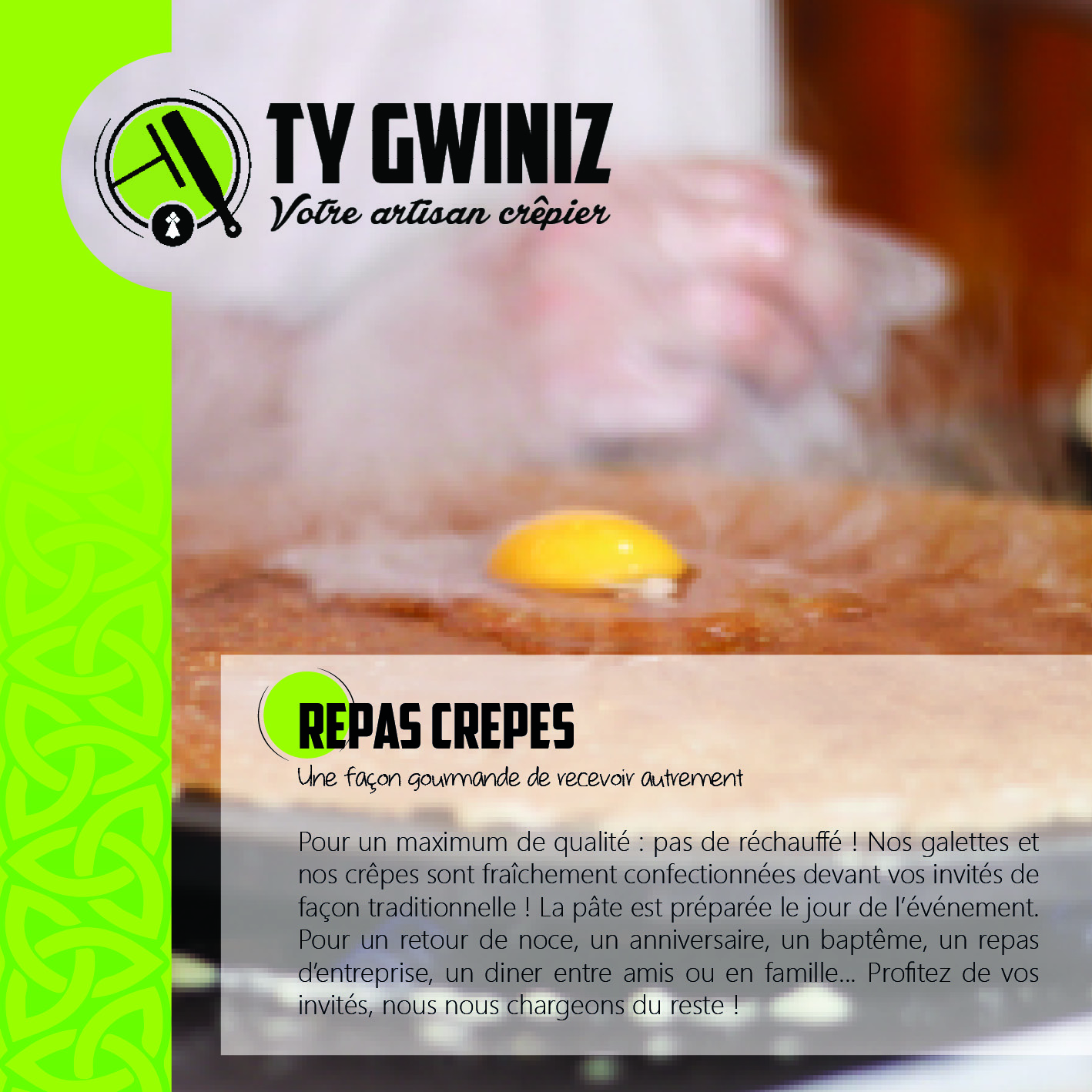 Nous avions sollicité Ty Gwiniz pour notre retour de noces et la prestation à vraiment répondu à nos attentes. Une organisation au cordeau, des prestataires agréables et serviables et des galettes et crêpes bien garnies et délicieuses ! Nos invités ont adoré la formule ! Merci beaucoup pour le très bon moment passé grâce à vous 👍.