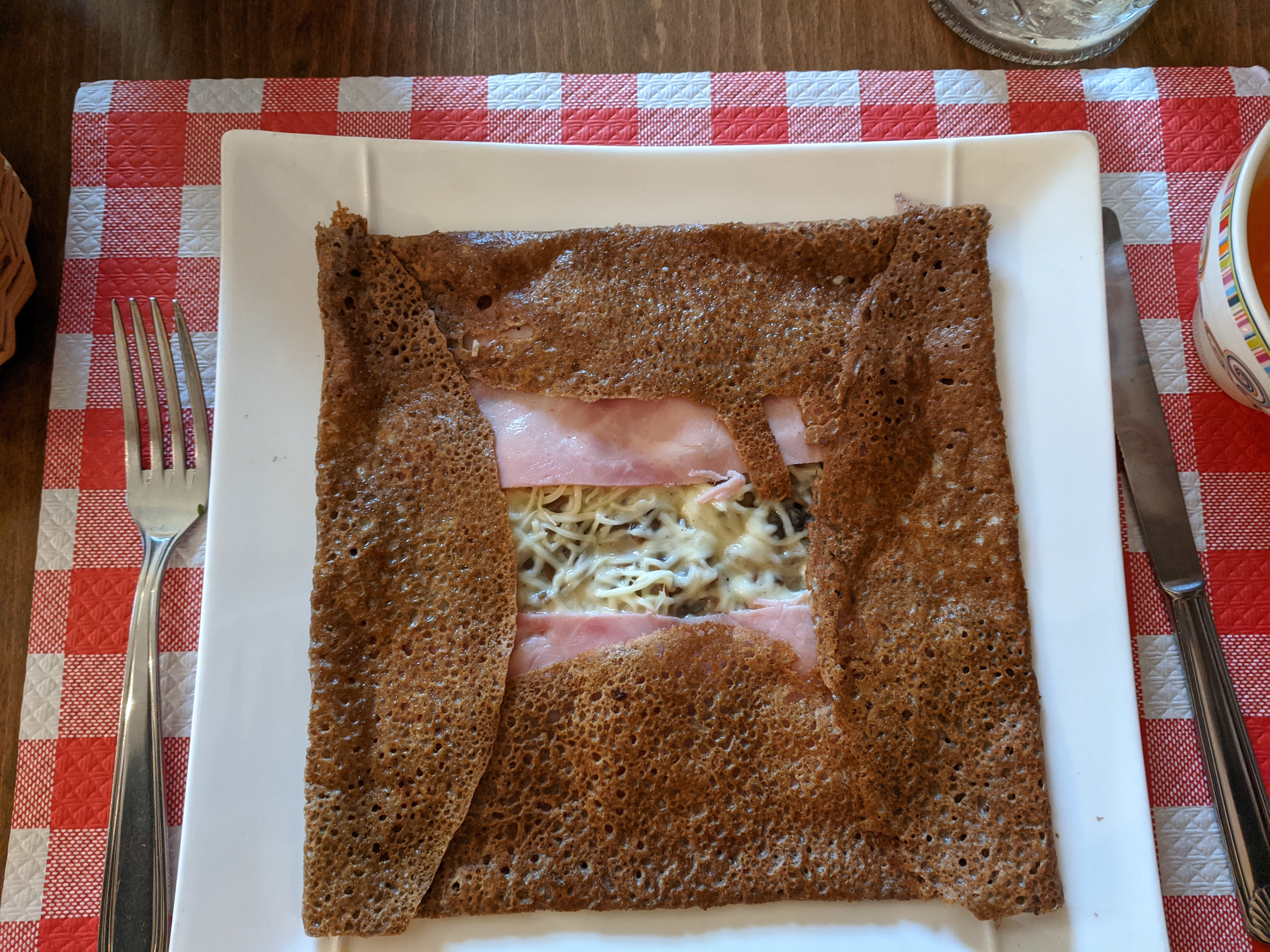 Nous avons pris 2 galettes complètes dont une avec un supplément champignons. Galettes peu croustillantes, gruyère mal réparti, champignons en conserves (?) Service rapide, personnel agréable, ambiance familiale.
