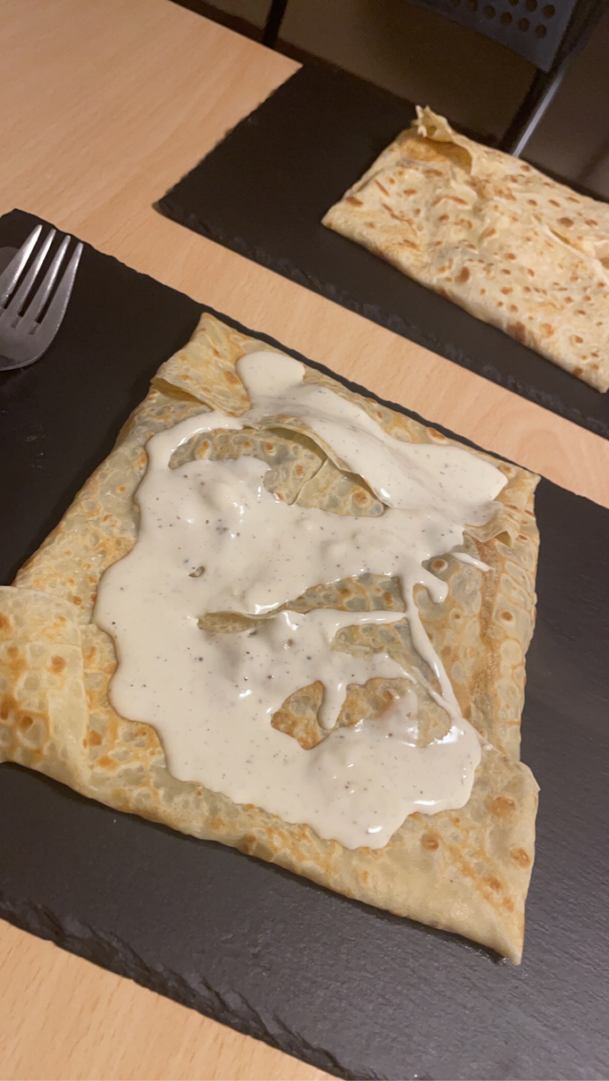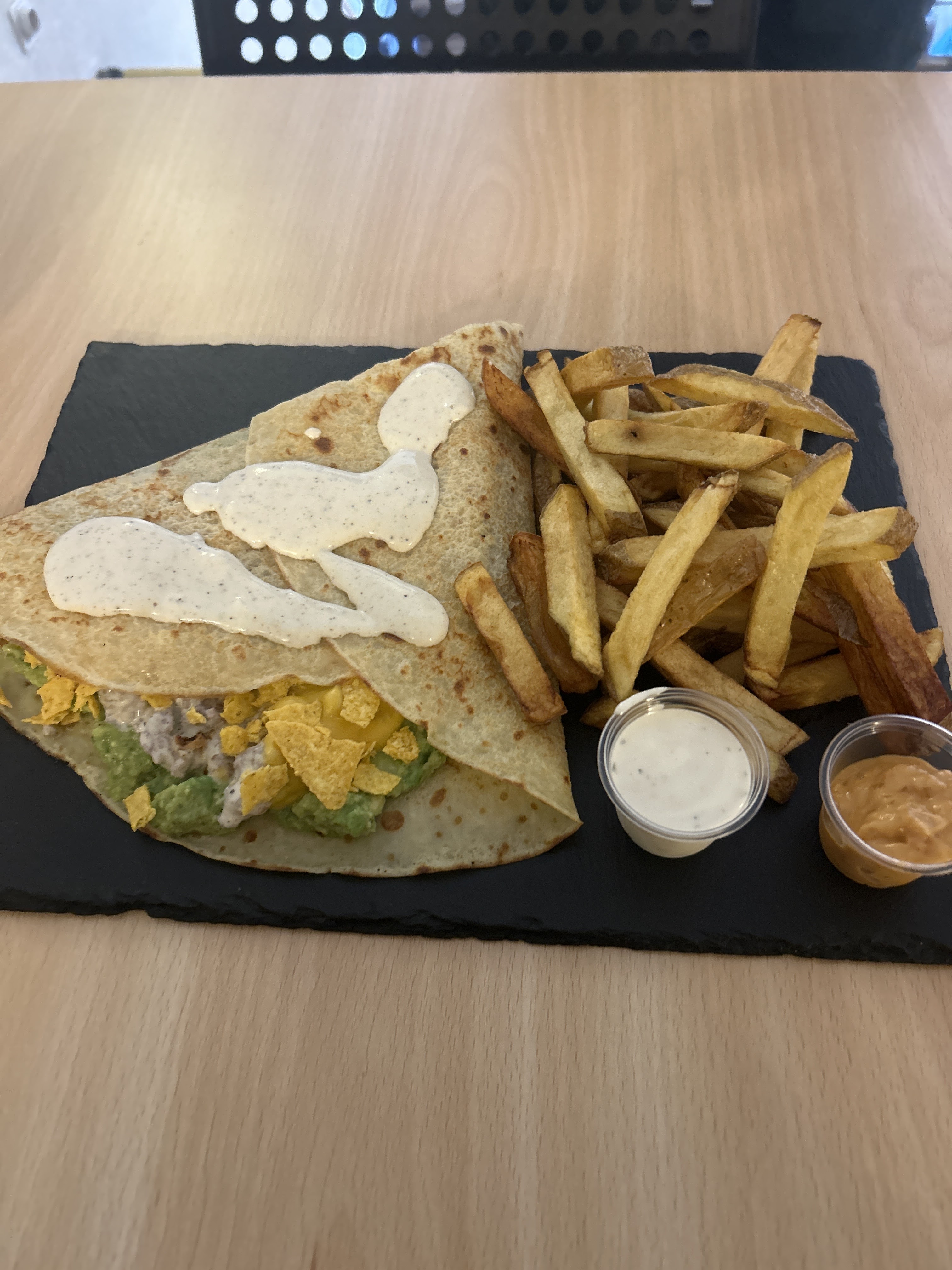 On a commandé deux crêpes salées avec 6 ou7 garnitures dedans avec lescalope fromage pomme de terre sauce fromagere champignon lardon oignon bref je ne sais plus mais une crêpe avec une compo attirante et bien chargée et apres 1h d’attente…. Oui une heure ( il y avait 6 personne avant nous je crois et le chef été seul a cuisiner donc je comprends meme si je n’attendrais plus jamais autant mais sa ok pas de souci) mais alors attendre une heure pour recevoir sa et payer 9€ par crepe c’est inadmissible… la crêpe franchement elle été bonne mais elle ete complètement vide de chez vide et toute plate ! Meme ma fille de 8ans m en aurait demander une deuxième si elle aurait présente… franchement faire attendre autant ok mais recevoir un truc vide a ce prix là c’est honteux. Je voulais pas afficher la photo intérieure pour ne pas que mon commentaire soit rabaissant mais pluto dans la visée de vous reformer!! On est venu dîner on a attendu une heure on ressortir le ventre vide et filer directement a la foire manger des sucreries. J’espère que vous ameliorer cela car là c’était vraiment grave .